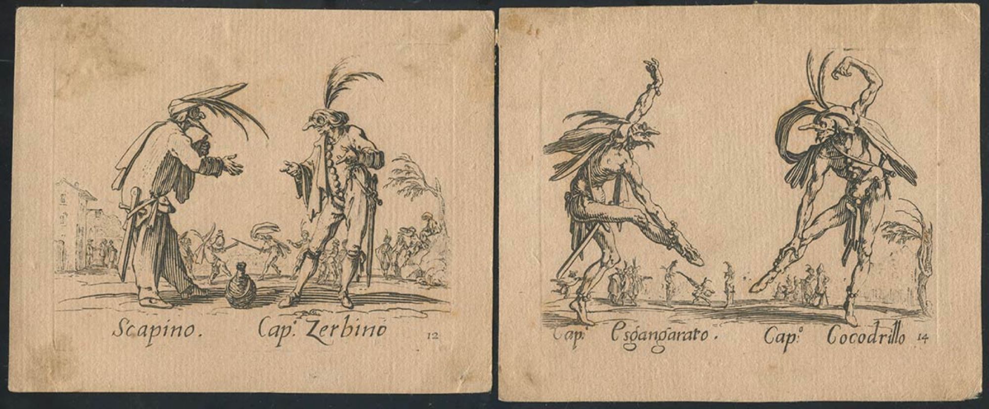 Jacques Callot (1592-1635): SCAPINO E CAPITANO ZERBINO' E 'CAPITANO ESGANGARATO AND CAPITANO COCODRILLO'