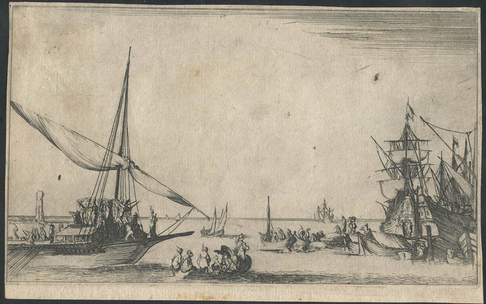 Stefano Della Bella (1610-1664): PAESAGGIO MARINO CON IMBARCAZIONI E FIGURE