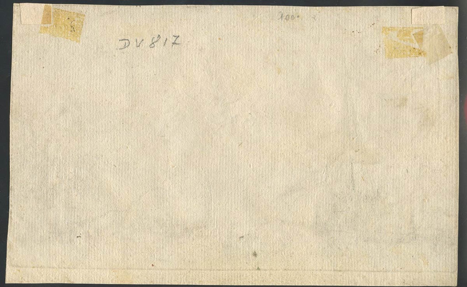 Esemplare con sottili margini oltre l’impronta della lastra, stampato su carta vergata con filgrana. Residui di colla e cartacei al verso. Per il resto in ottimo stato.