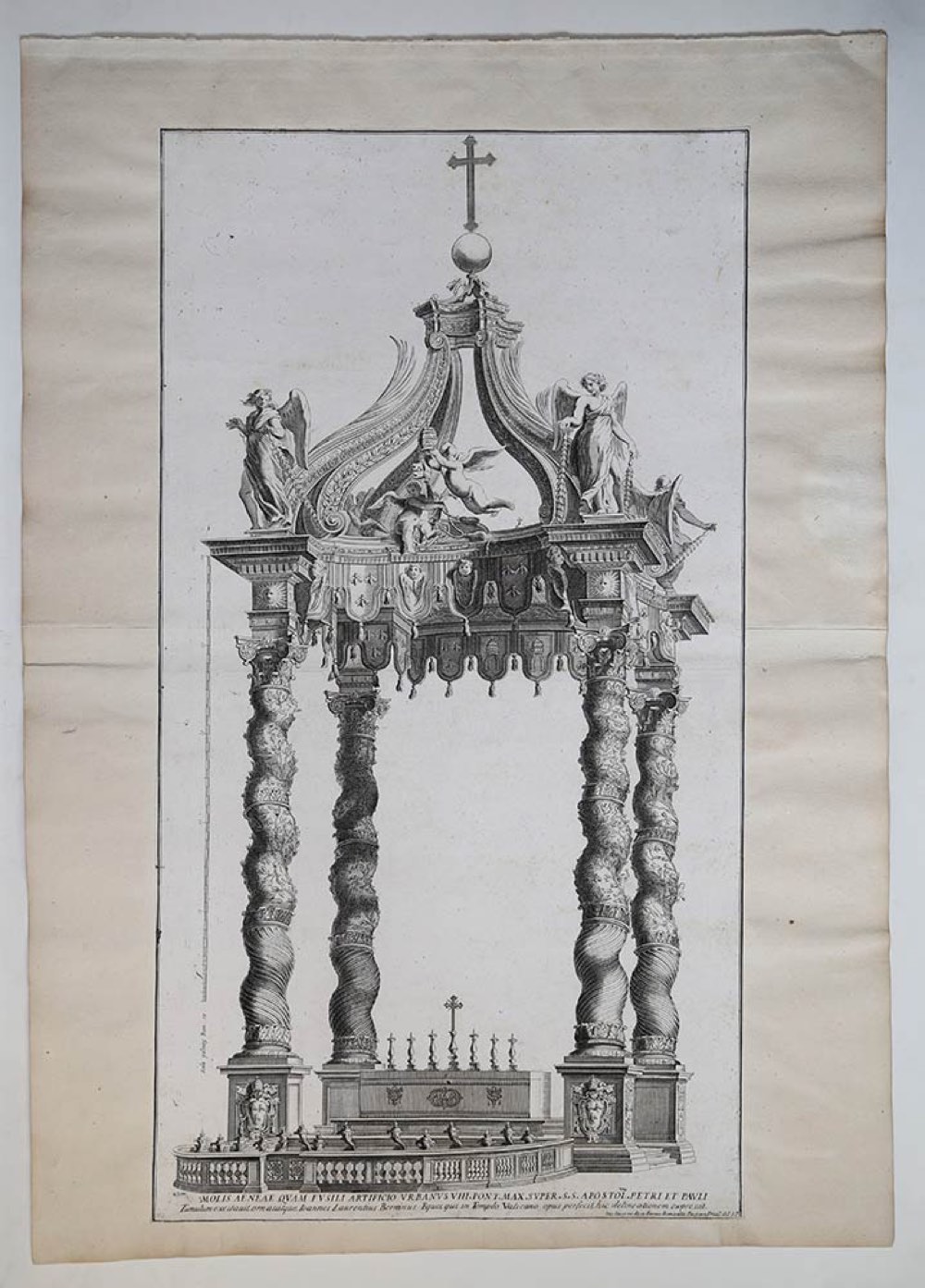 stampata da 'Gio Giacomo Rossi Formis Roma alla Pace'. L’incisione mostra il celebre baldacchino di Gian Lorenzo Bernini, che fu commissionato da papa Urbano VIII nel 1624.