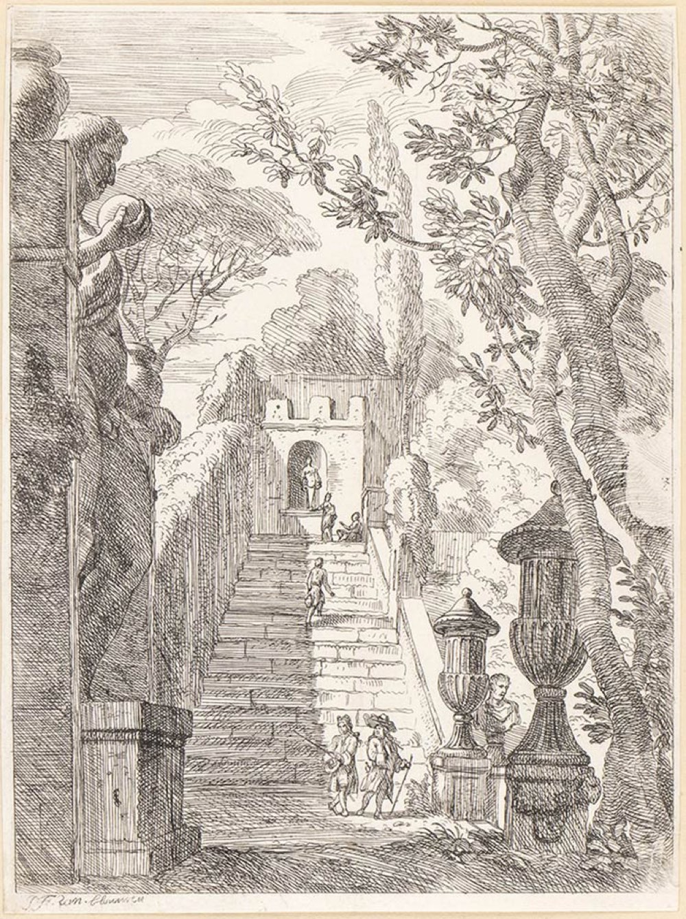 Esemplari rifilati, applicati in quattro punti al foglio di carta. Buono stato di conservazione. 'Veduta con la scalinata' presenta un strappo in basso alla destra.