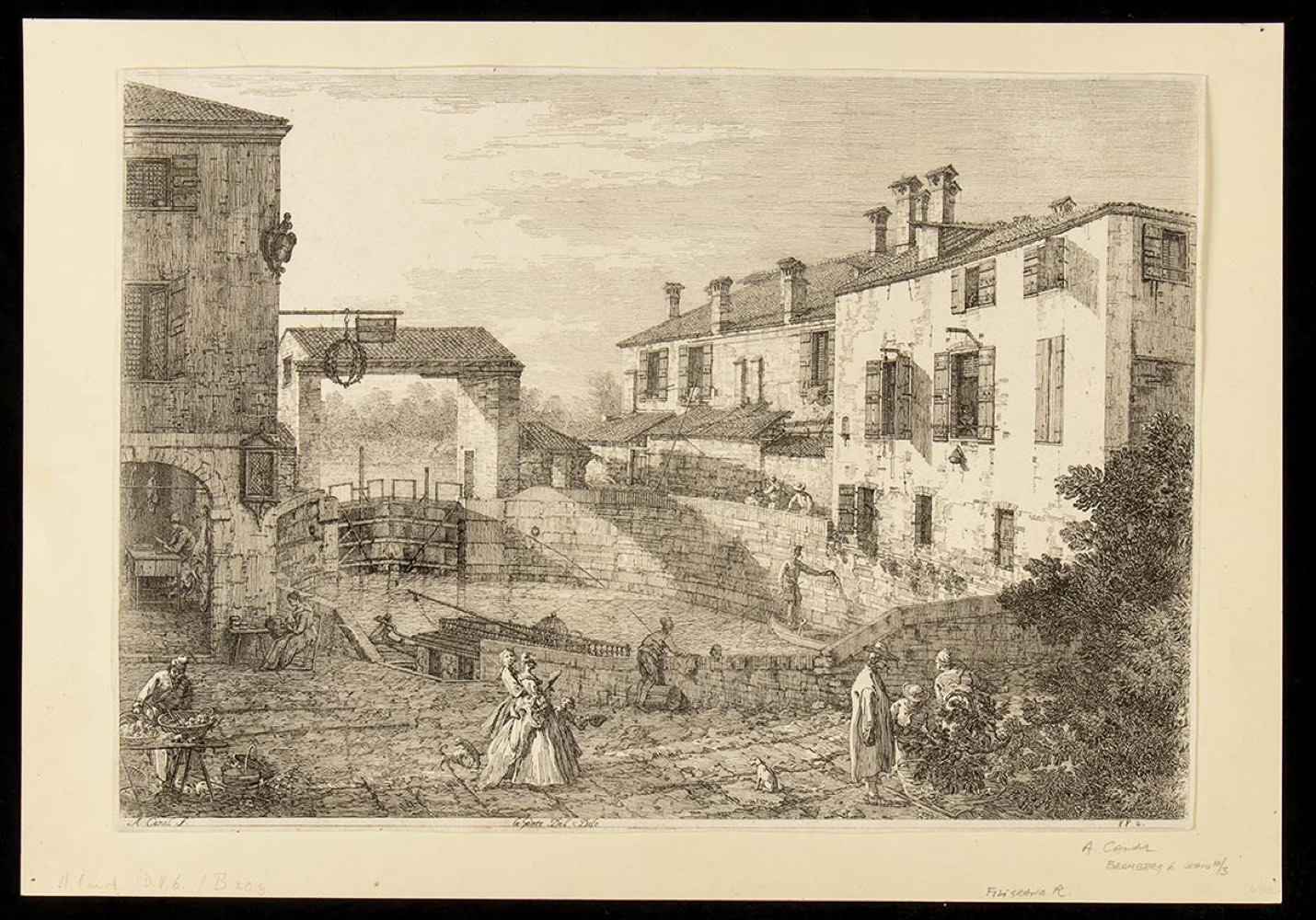 tratta dalla serie 'Vedute altre prese da i luoghi altre ideate da Antonio Canal'. La stampa raffigura gli ediffici intorno la ovale conca di navigazione di Dolo a Venezia. Stato III su III.