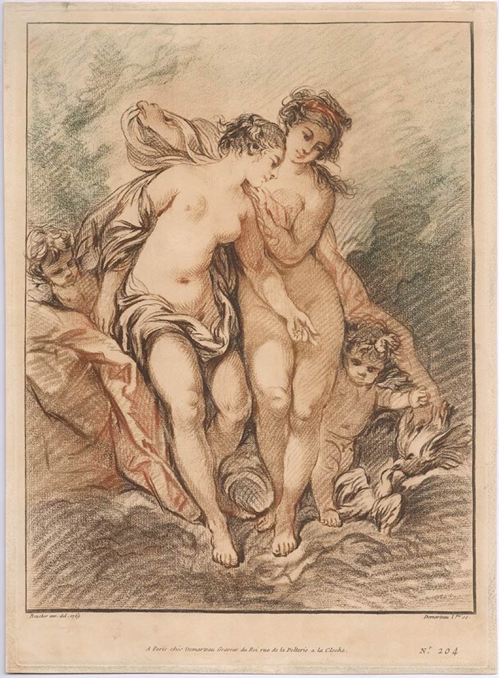 Gilles Demarteau (1722-1776) da François Boucher (1703-1779): DEUX NYMPHES ET DEUX AMOURS REGARDANT DES COLOMBES