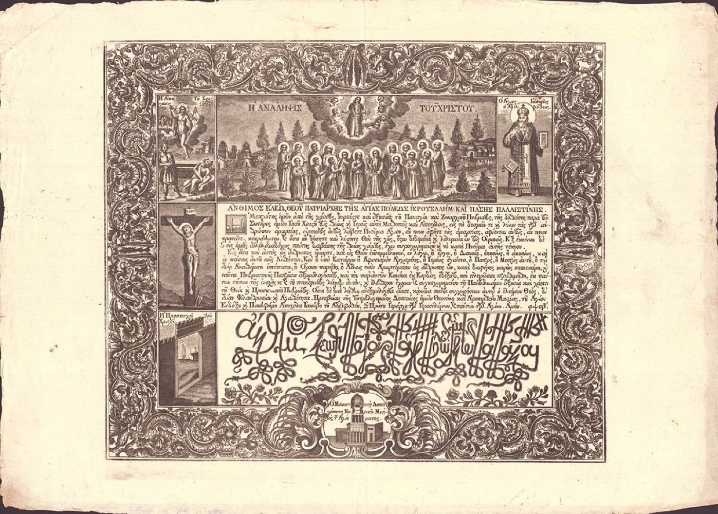 Stampa popolare a tematica religiosa con caratteri greci e arabi.