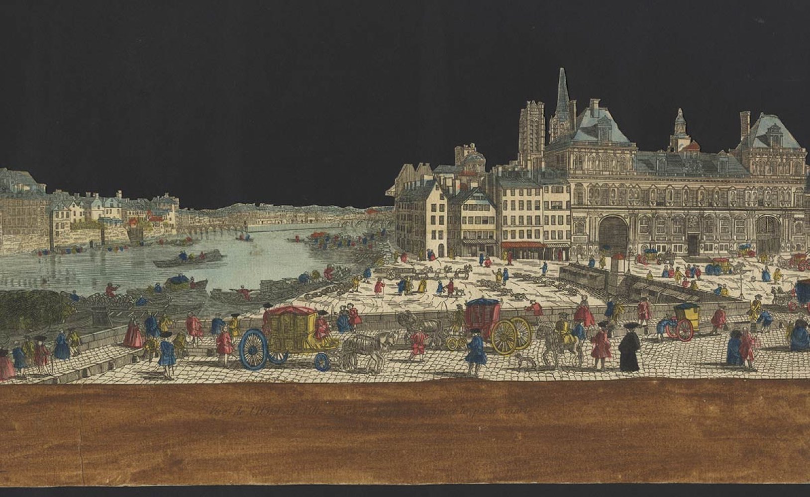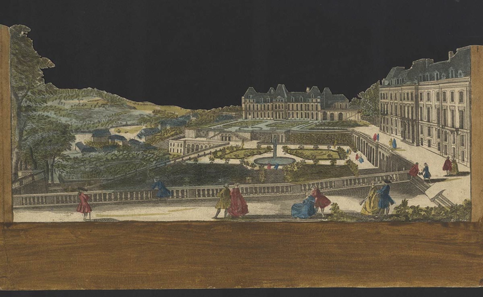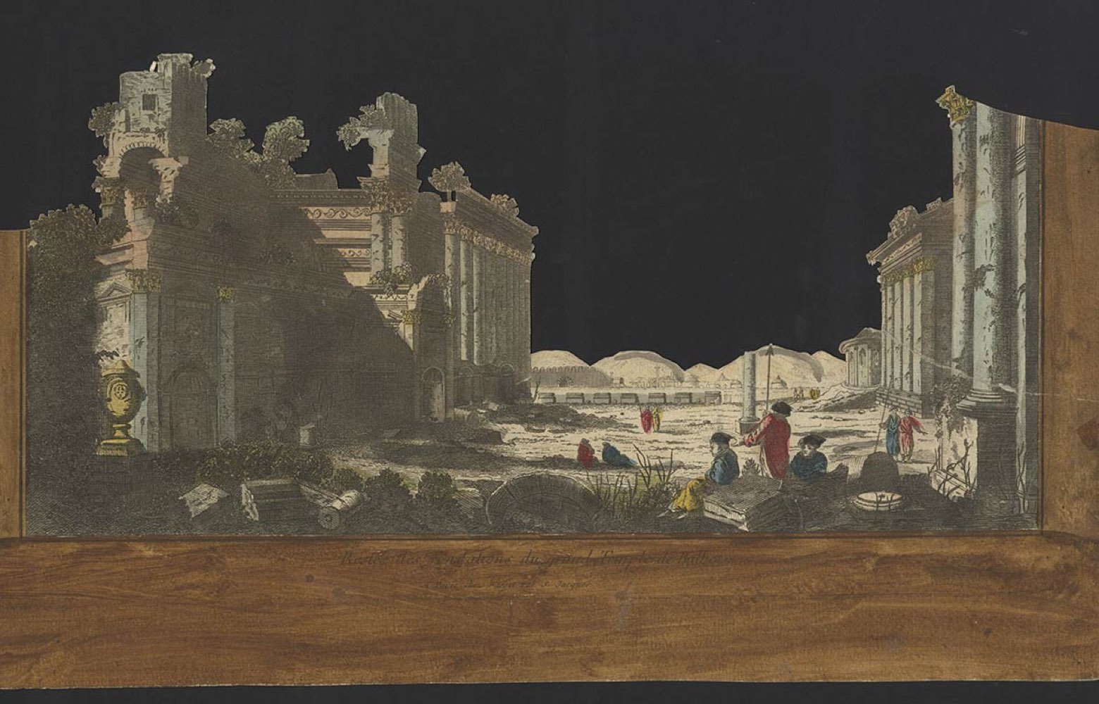 lotto di 8 'Vue Optique' con la tipica coloritura vivace a colori primari di questo tipo di stampe. Stampate a Parigi CHEZ JACQUES CHEREAU, a metà XVIII secolo. Esemplari ritagliati per essere inserite nella lanterna magica, che consentiva poi la visuale ottica della vedute con l'aiusilio di una fonte luminosa artificiale.
