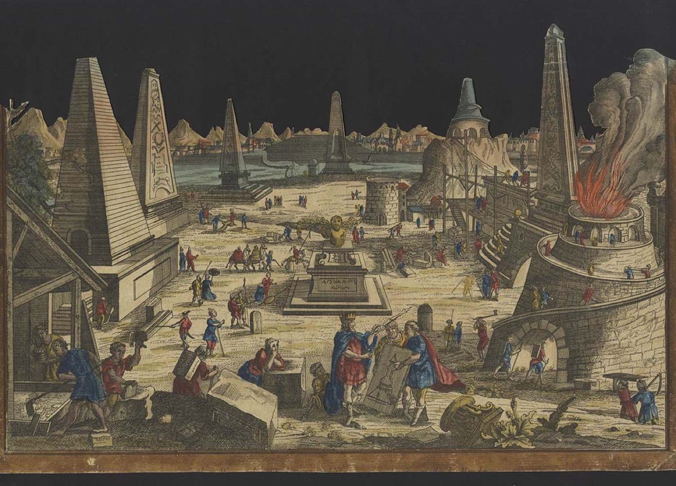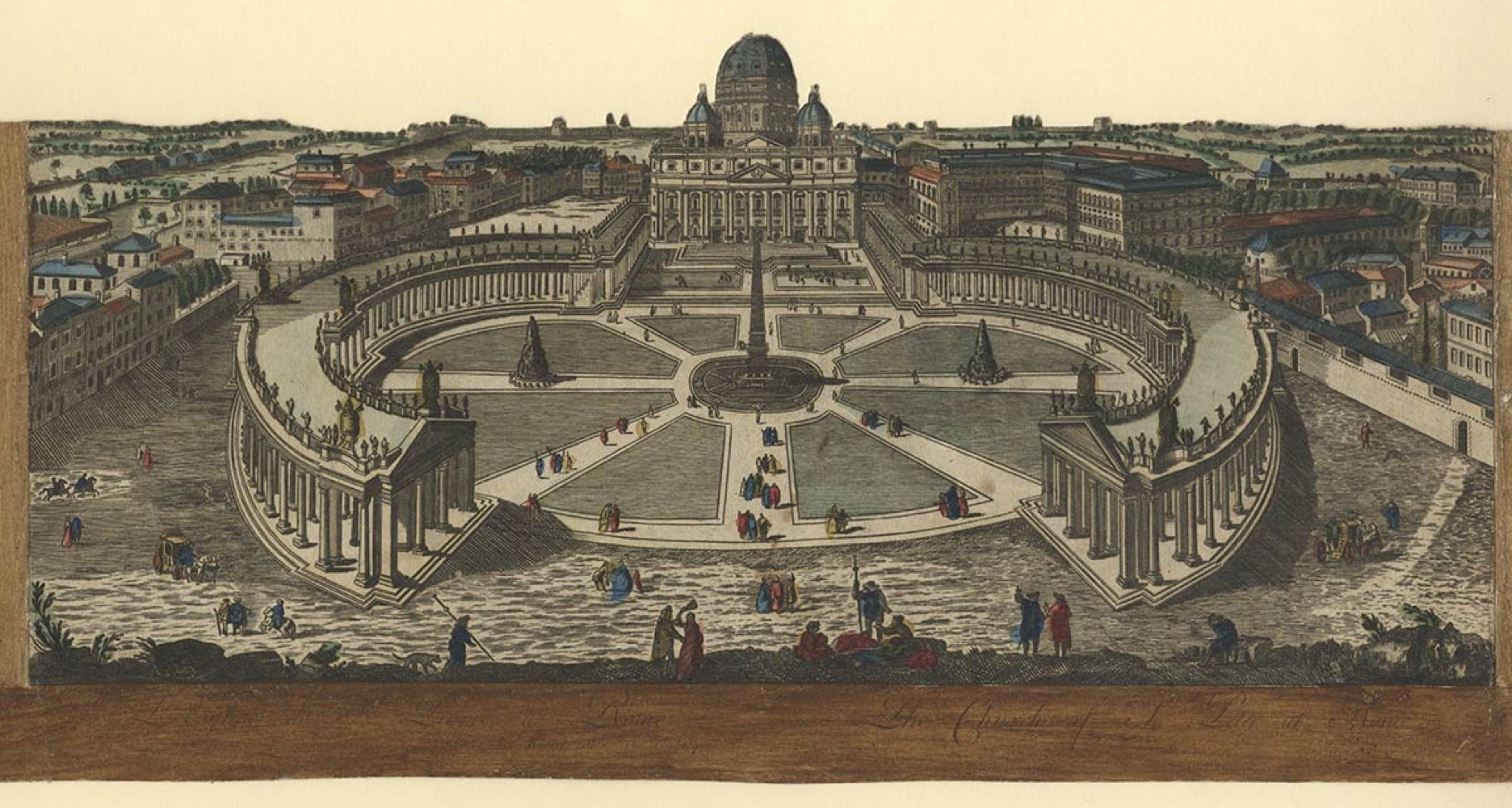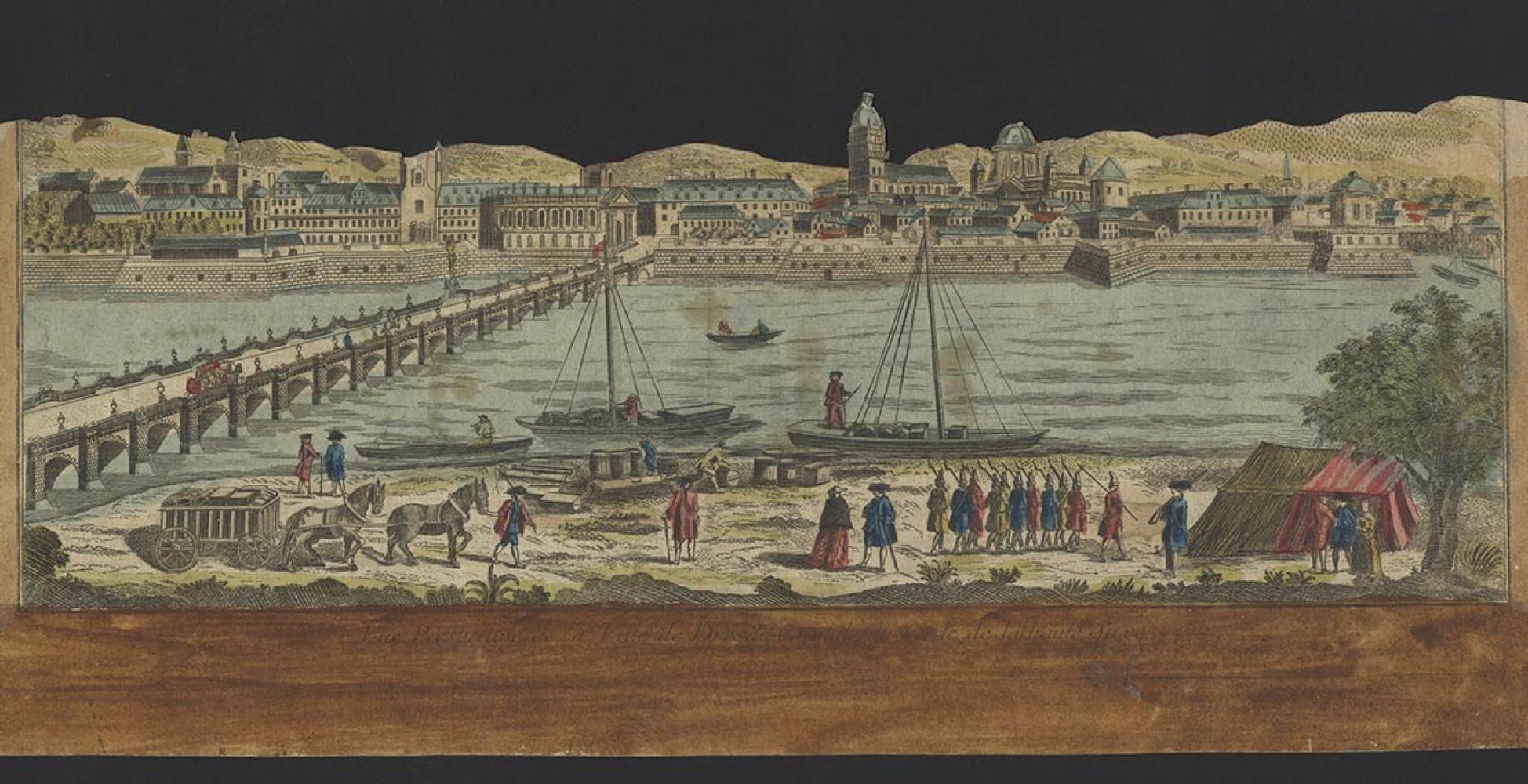 lotto di 8 'Vue Optique' con la tipica coloritura vivace a colori primari di questo tipo di stampe. Stampate a Parigi CHEZ JACQUES CHEREAU, a metà XVIII secolo. Esemplari ritagliati per essere inserite nella lanterna magica, che consentiva poi la visuale ottica della vedute con l'aiusilio di una fonte luminosa artificiale.