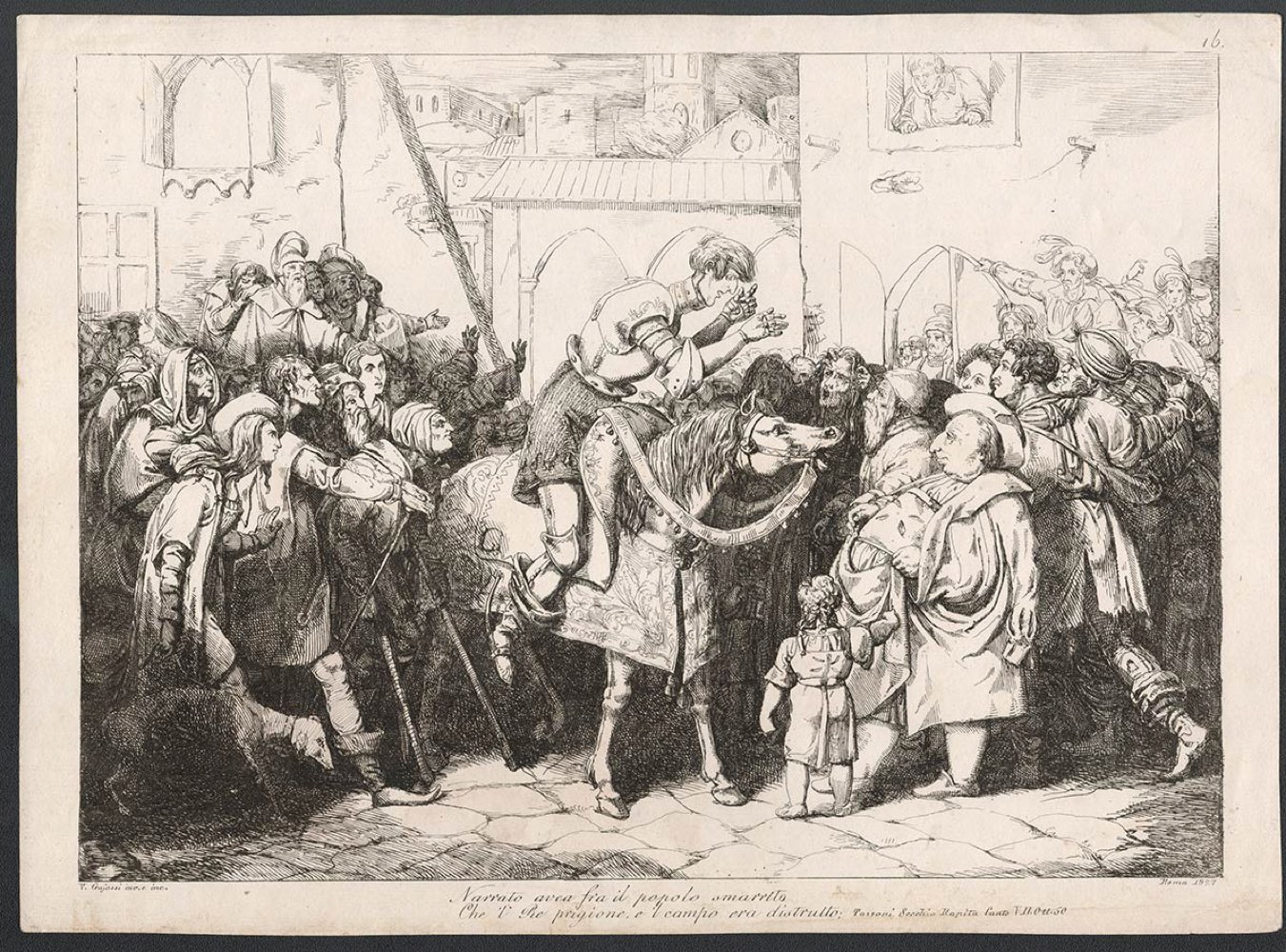 tratta dalla serie di acqueforti rappresentanti le scene di 'Secchia Rapita' di Alessandro Tassini (1622). Data e luogo in angolo basso a destra della lastra: Roma 1827.