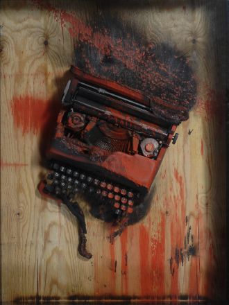 Bernard Aubertin (Buolay, 1952) Macchina da scrivere sottsass, 2010 Combustione su tavola, cm. 59,5x80 Firma e data sul verso.
