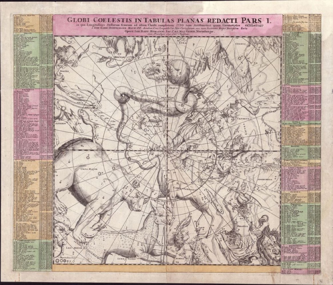 Il cielo notturno con le costellazioni zodiacali rappresentate secondo la mitologia classica: parte I - Orsa Maggiore, Camelopardius, Lynx S. Tigris, Cassiopea, Cepheus, Draco e Ursa Minore. Pubblicato a Norimberga nel 1741, la carta astronomica si rifà a Doppelmayr.