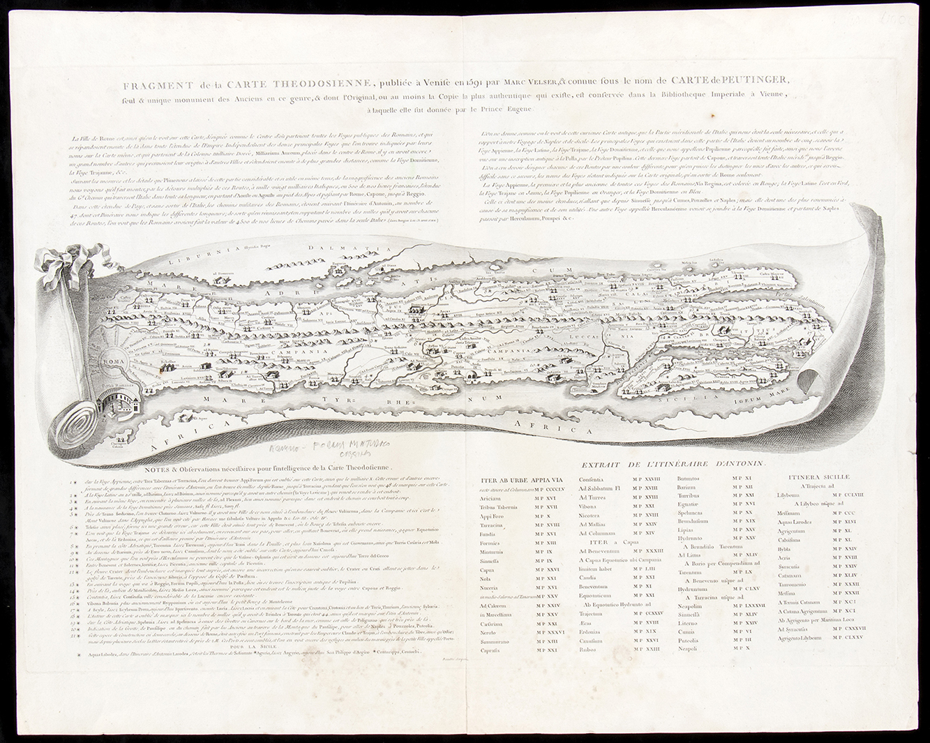 La mappa a forma di lungo cartiglio, rapresentante le strade dell'Italia meridionale e della Sicilia. Accompagnata dal testo in francese.