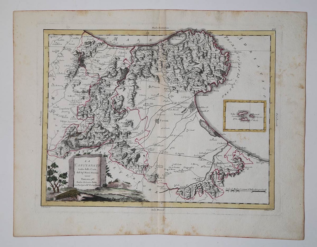 Incisione in rame con coloritura d’epoca dei confini e del cartiglio decorato. La stampa è tratta dalle carte disegnate da Giovanni Antonio Rizzi Zannoni (1736-1814), cartografo e geografo padovano. Bell’esemplare del territorio con le isole Tremiti. Tratta da Atlante Novissimo. Pubblicata da Antonio Zatta a Venezia.