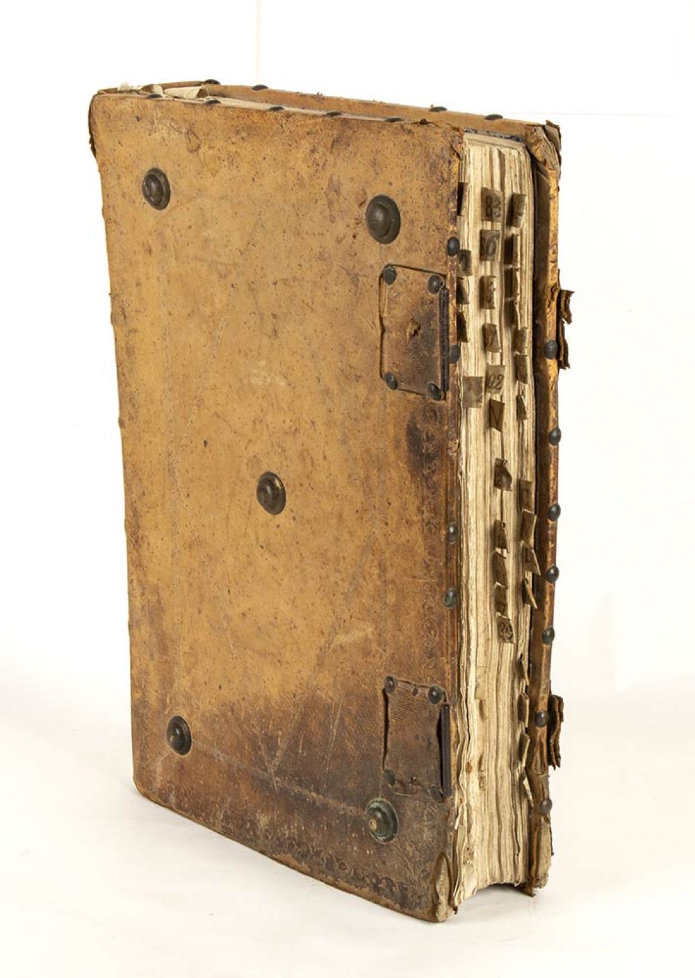 Discreto stato di conservazione. Lacune con perdite di testo restaurate. Qualche macchia e strappi ai margini della carta. Marginalia (lettera G) di antico mano su varie carte. Legatura in pelle marrone, sbiadita, usrata con spellature e difetti al dorso ed agli angoli. Fermagli mettallici.