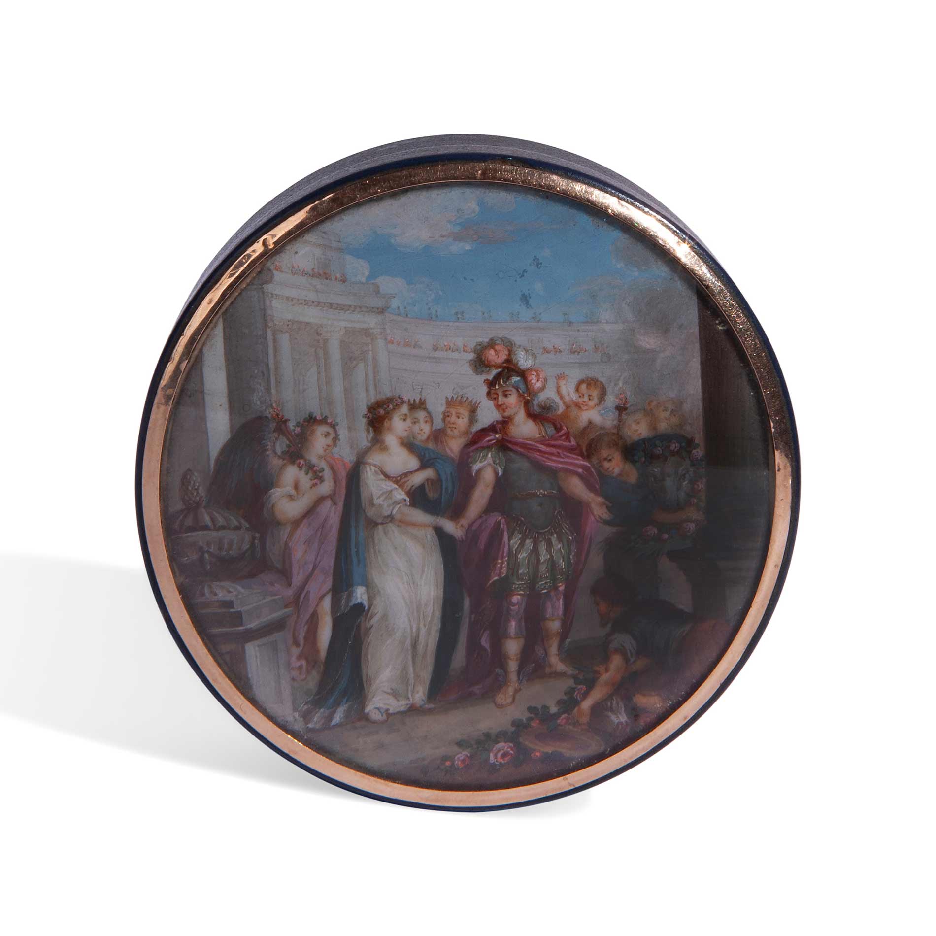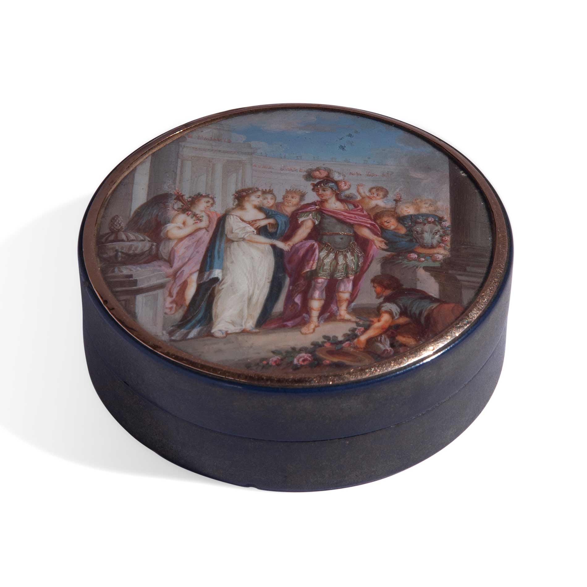 Scatola in tartaruga, oro e miniatura, inizi XIX secolo Manifattura italiana, miniatura raffigurante scena classica, oro 18 kti Diametro cm. 7,6
