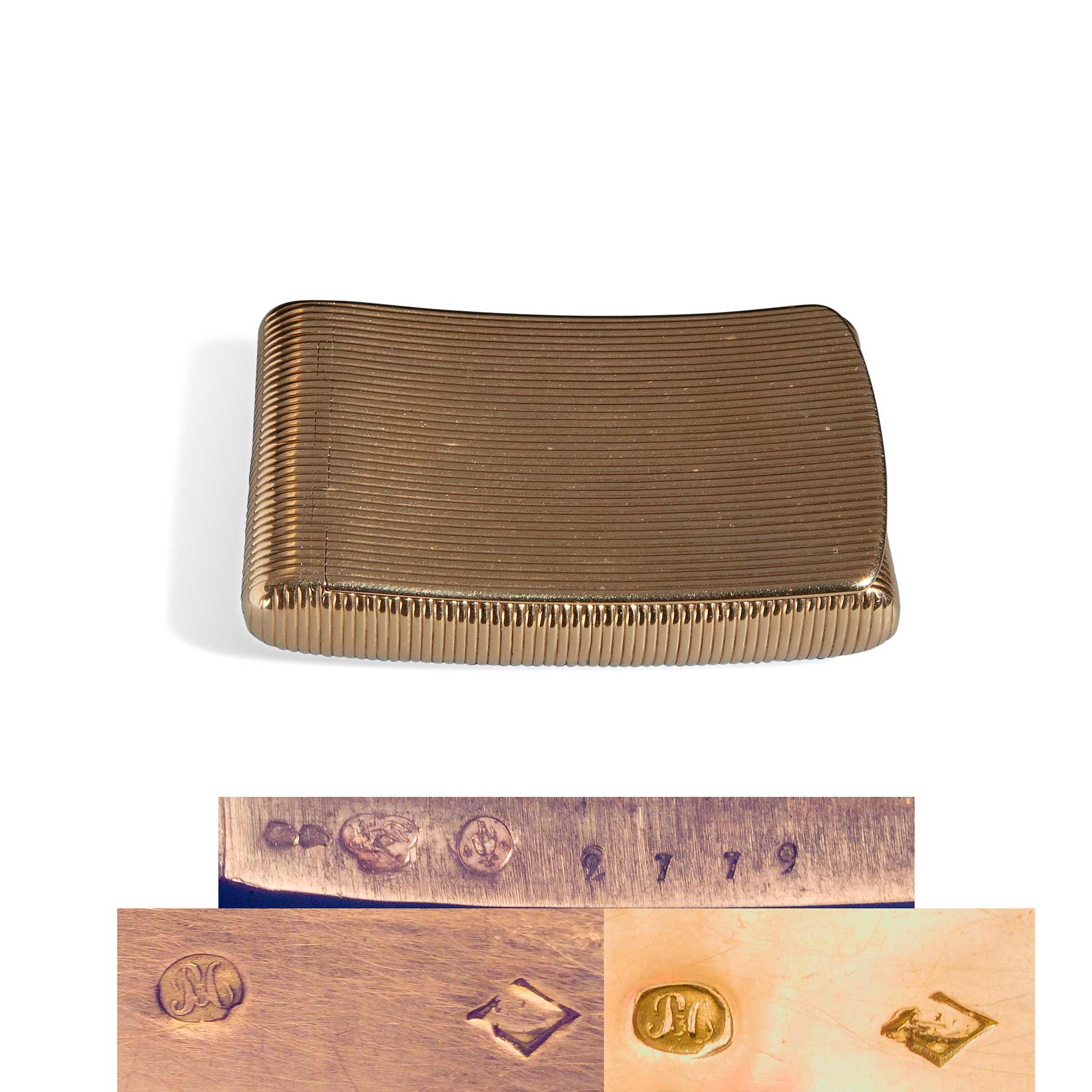 Tabacchiera da tasca in oro cesellato, Ginevra 1809-1819 Di forma anatomica, la superficie è interamente lavorata a centinature orizzontali. Realizzata a Ginevra, probabilmente nel dipartimento del Lemano, sono riportati i marchi in uso durante l'occupa