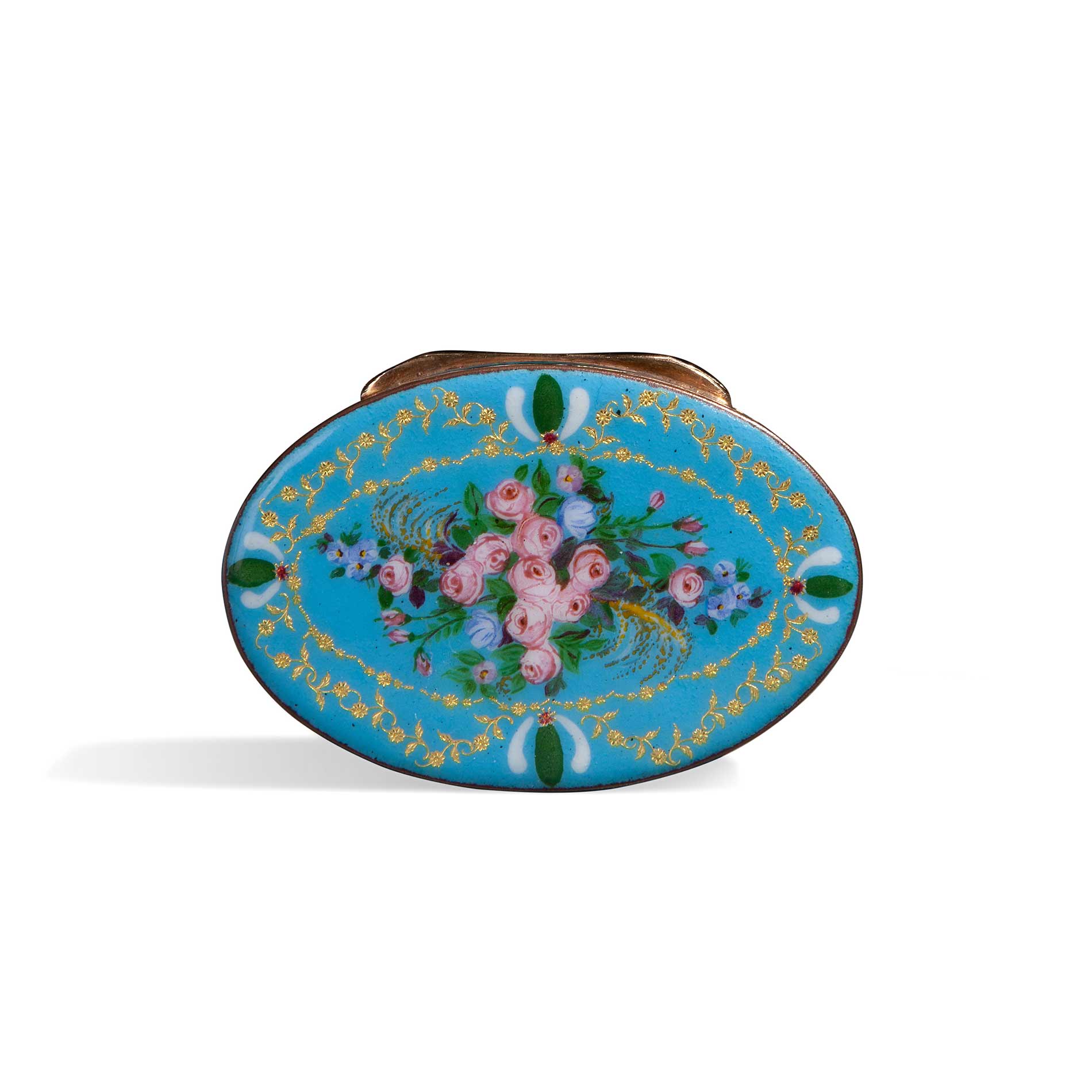 Scatola in oro e smalti, interamente decorata a motivi vegetali, inizio XIX secolo Manifattura destinata al mercato turco, oro 18 kti, peso complessivo gr. 110 Larghezza cm. 7,2