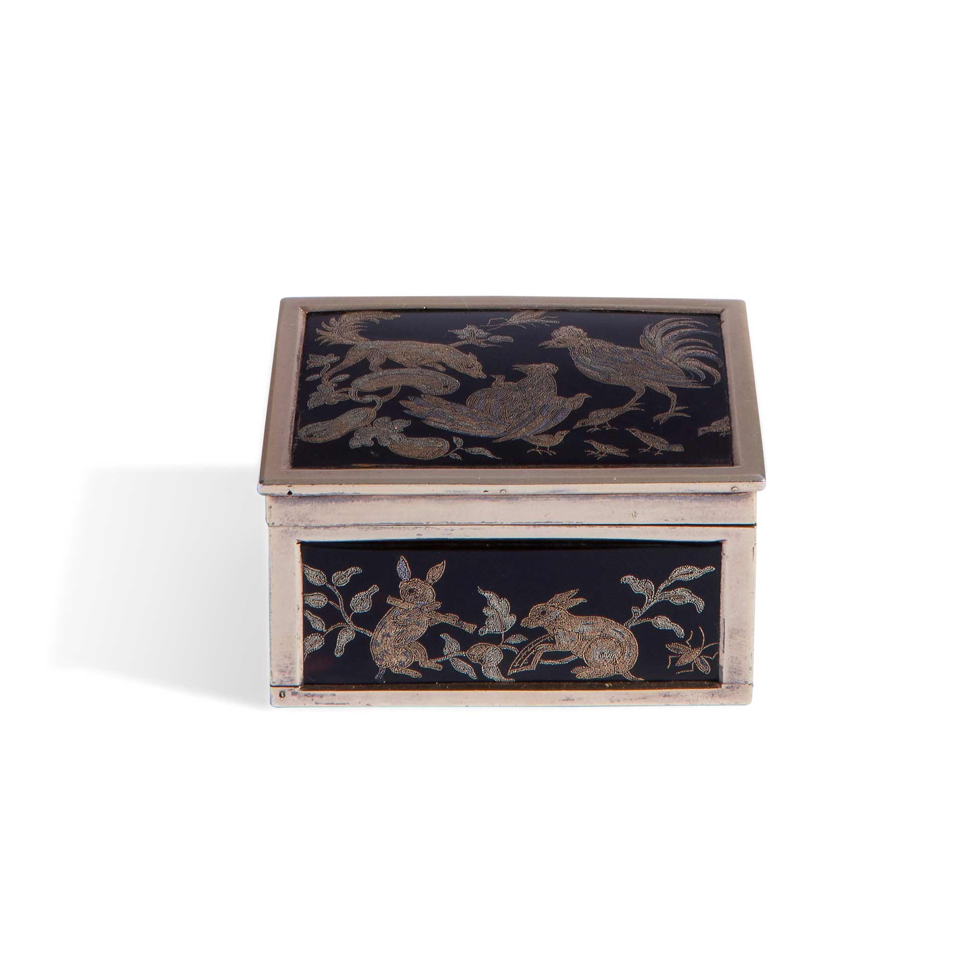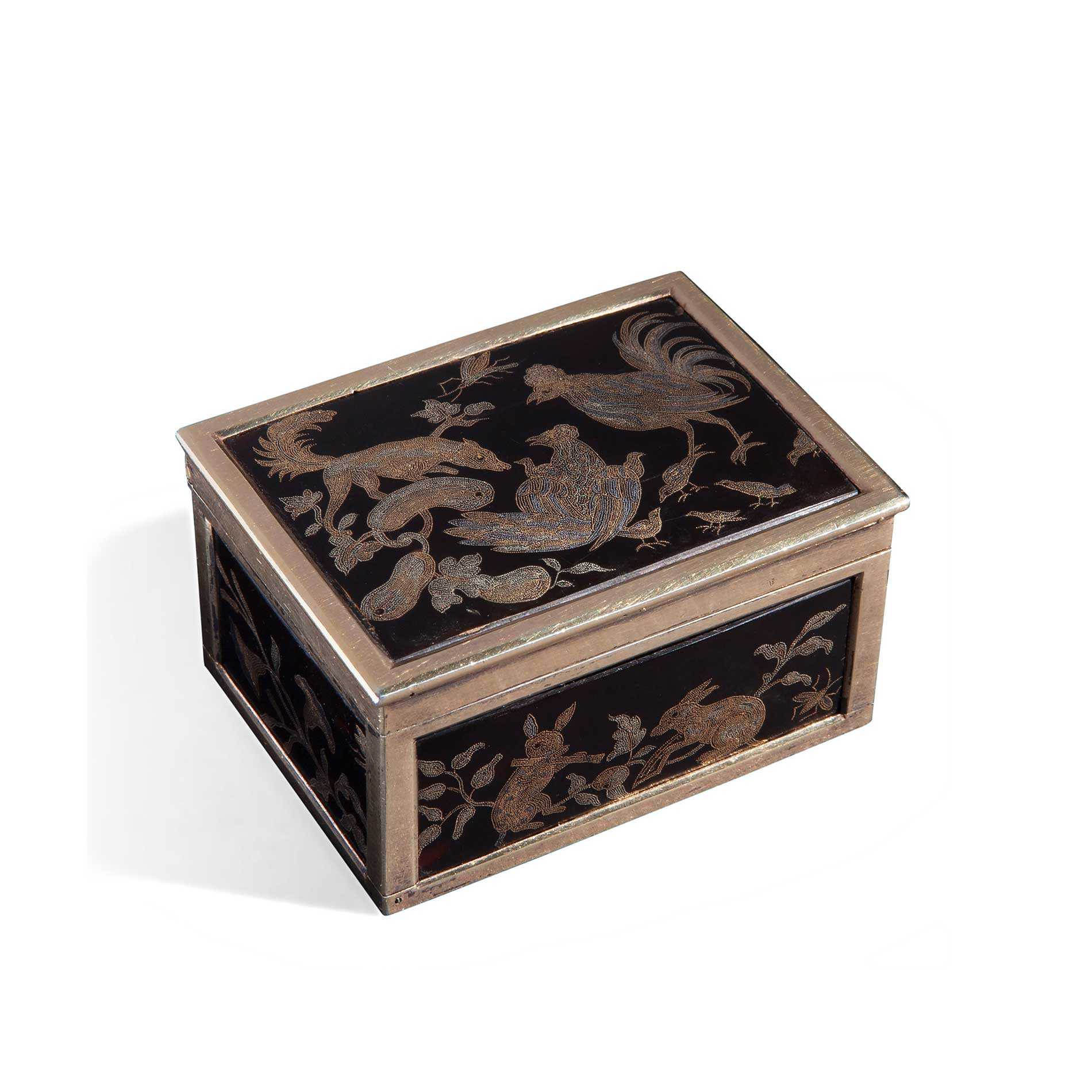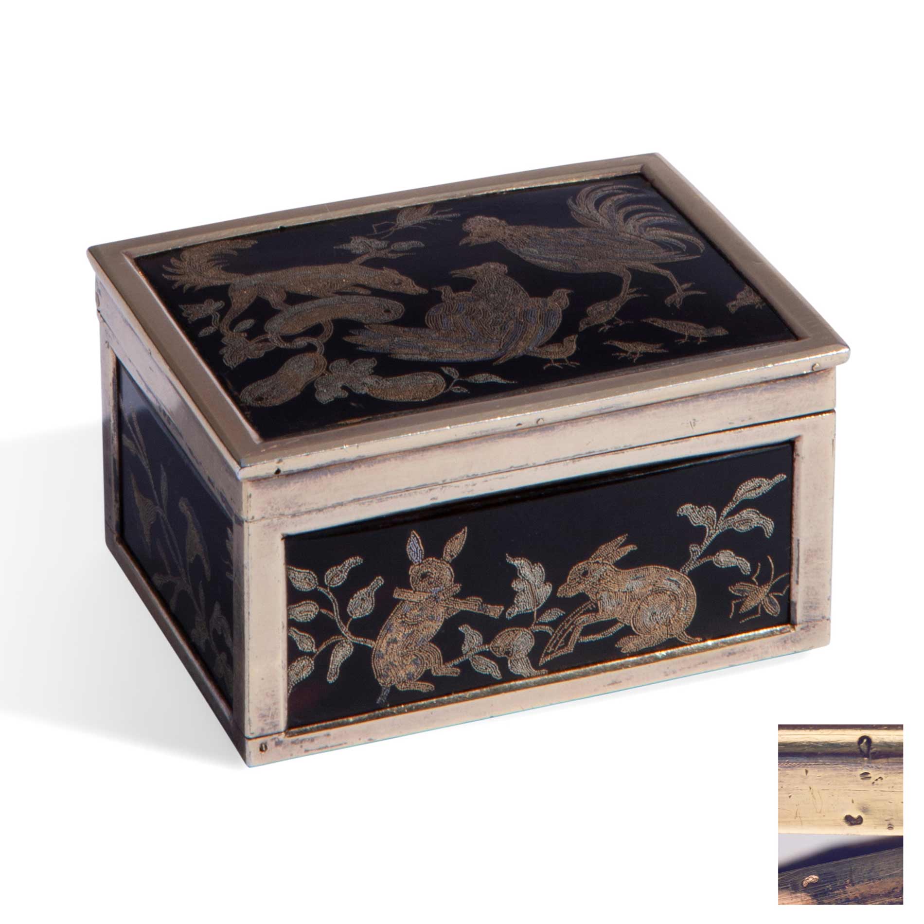 Elegante scatola in tartaruga, oro e argento dorato Placche in tartaruga del XVIII secolo, montatura del 1830 ca; decorazione in oro raffiguranti animali, fiori e frutti Larghezza cm. 7