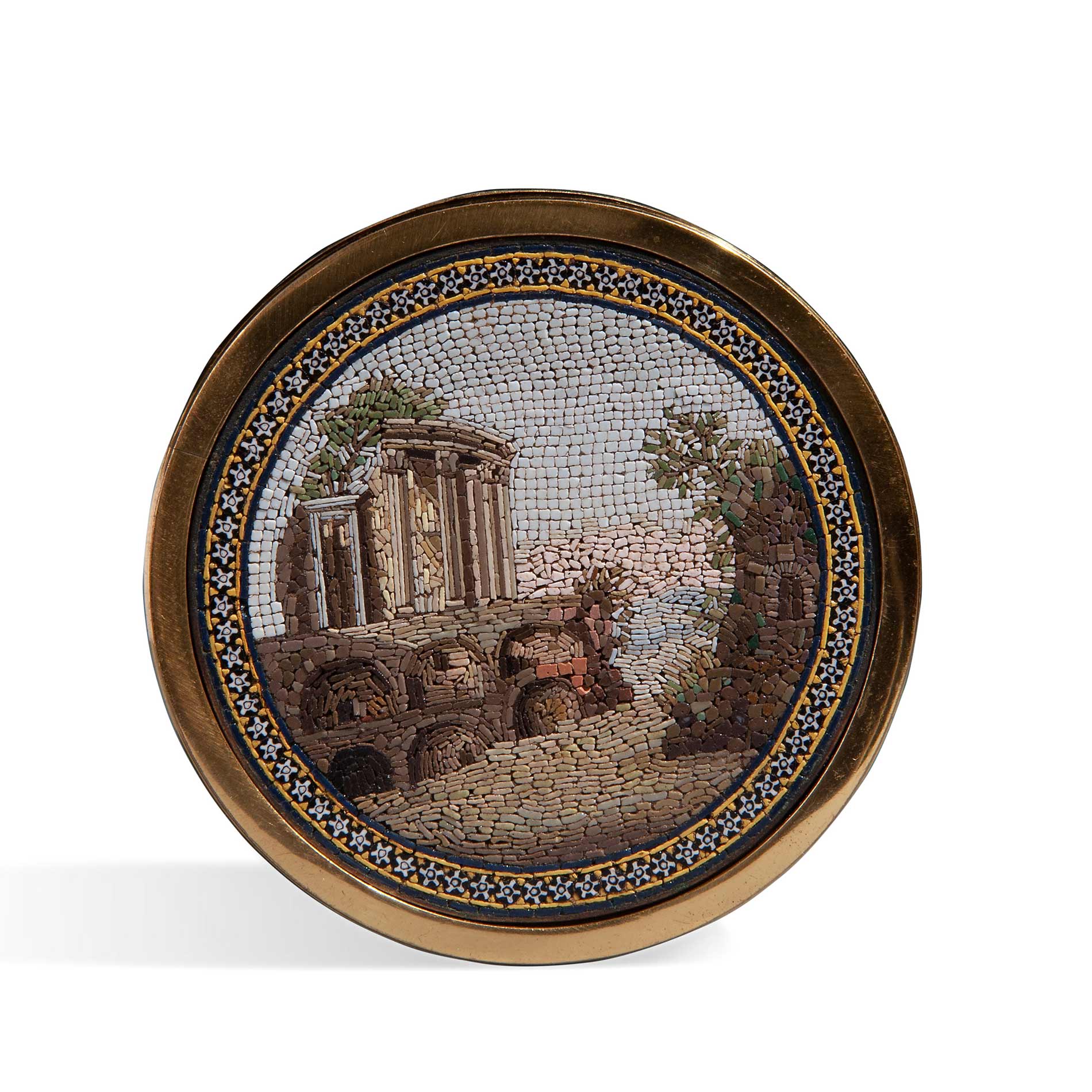Scatola tonda in tartaruga, oro e micromosaico, 1820 ca Manifattura della RFSP, micromosaico raffigurante rovine antiche Diametro cm. 8,4