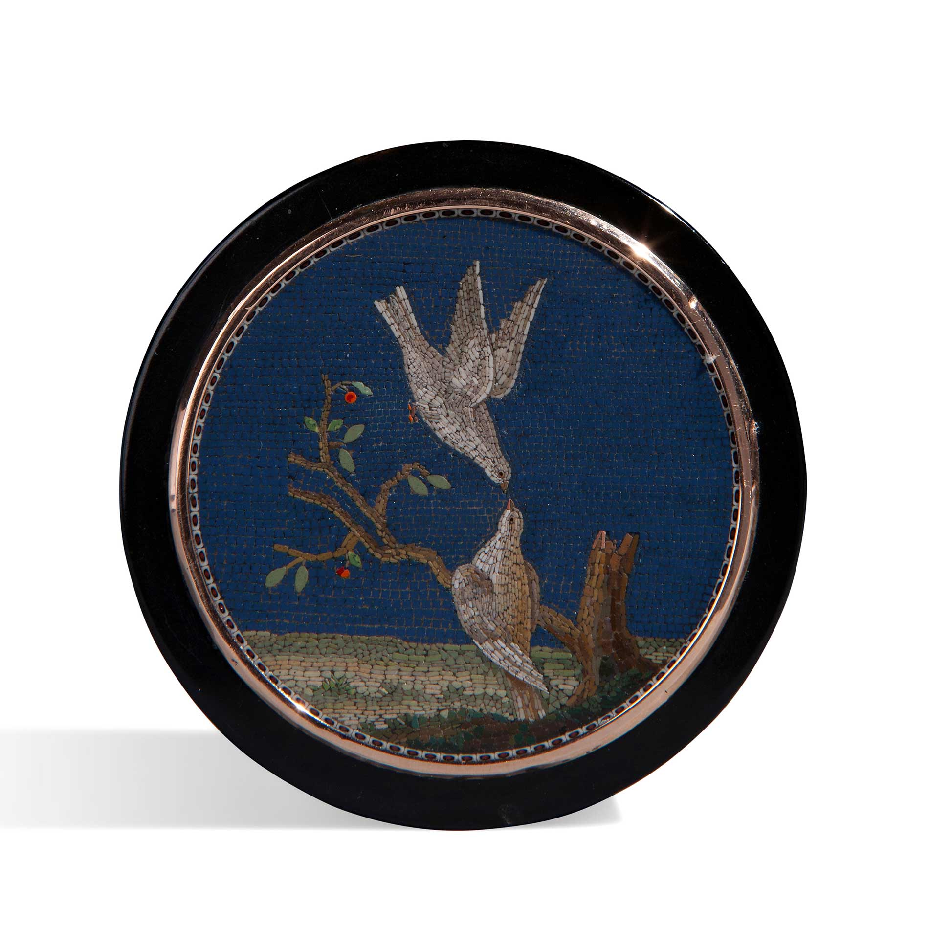 Scatola tonda in tartaruga, oro e micromosaico Manifattura della RFSP, del maestro Giacomo Raffaelli, oro 18 kti Larghezza cm. 7,4