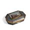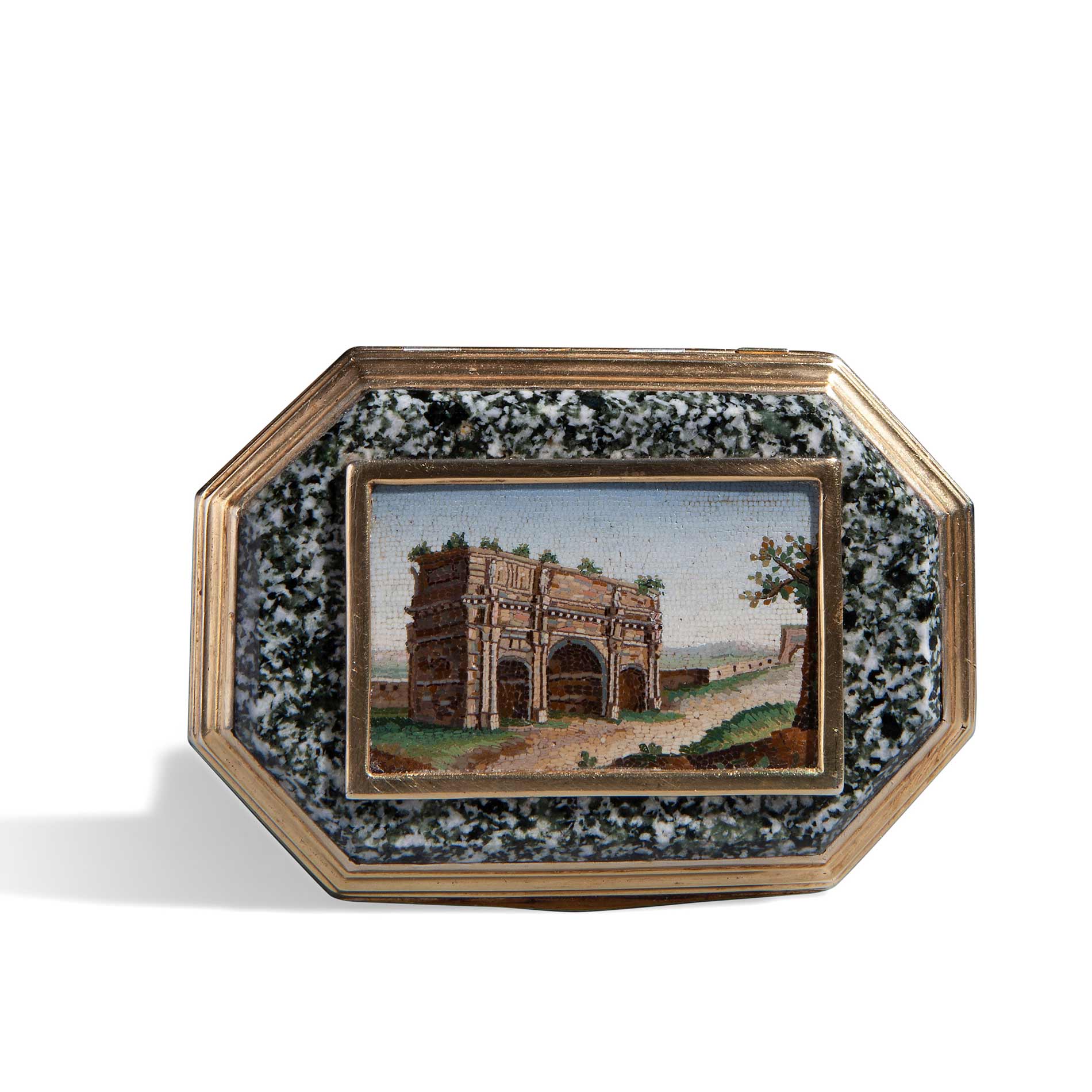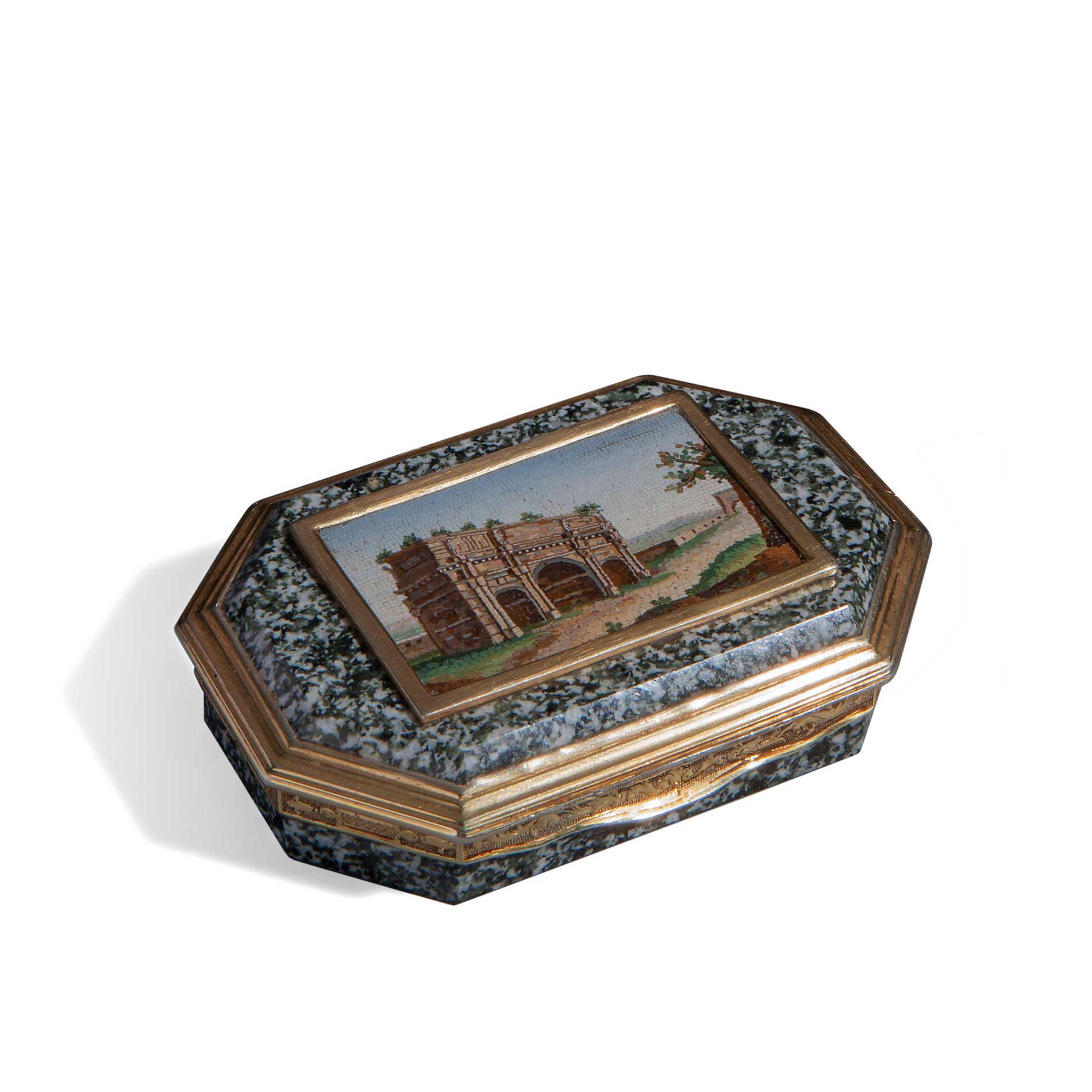 Scatola ottagonale in porfido, oro e micromosaico Manifattura della RFSP del 1800, micromosaico raffigurante rovine antiche Larghezza cm. 8,8