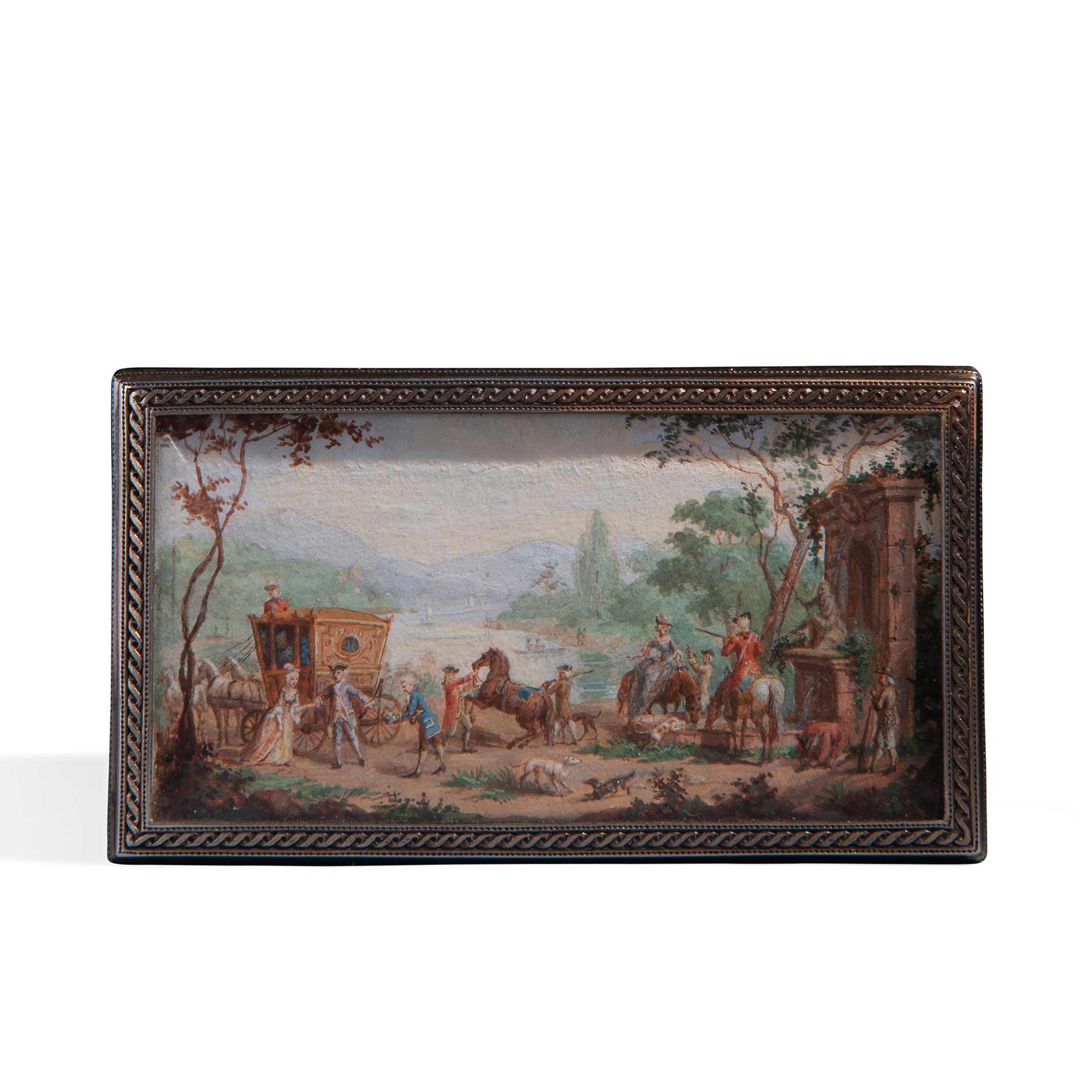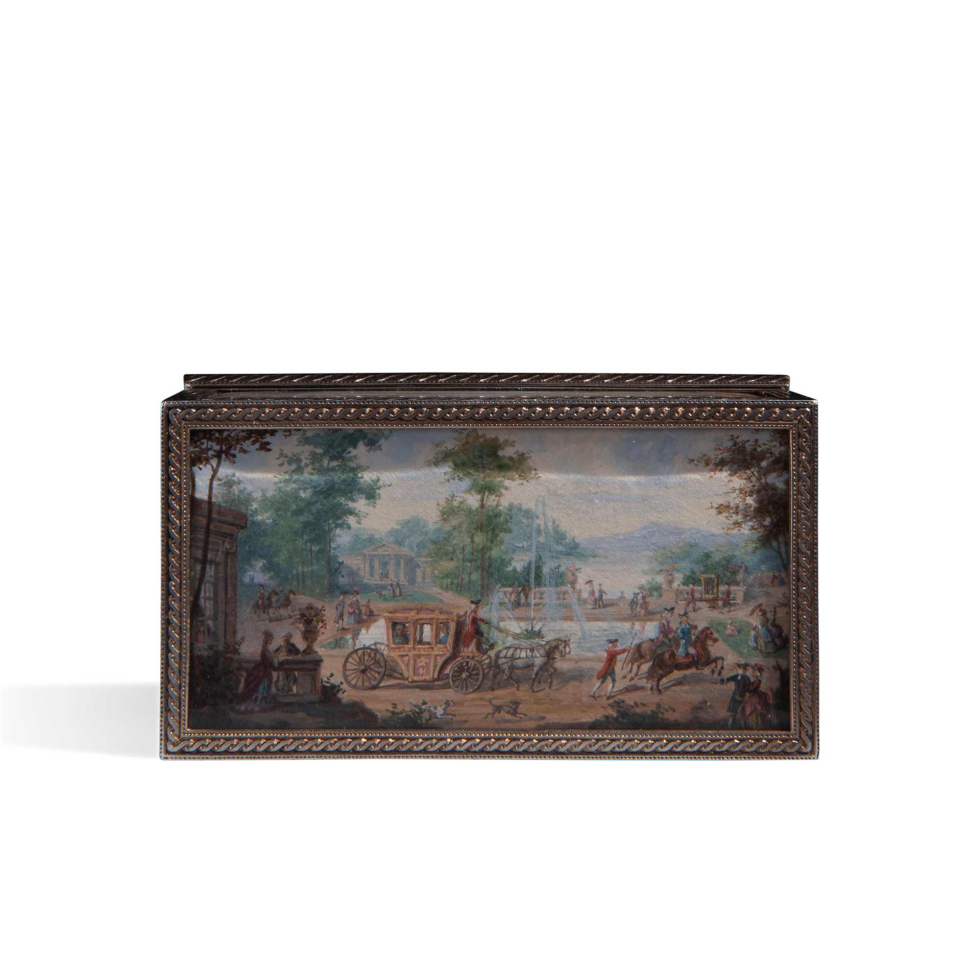 Elegante scatola composta da montatura in agento e argento dorato con ricche miniature Probabile manifattura fiamminga della seconda metà del XVII secolo, le sei miniature raffigurano paesaggi lacustri e scene galanti Larghezza cm. 8,7
