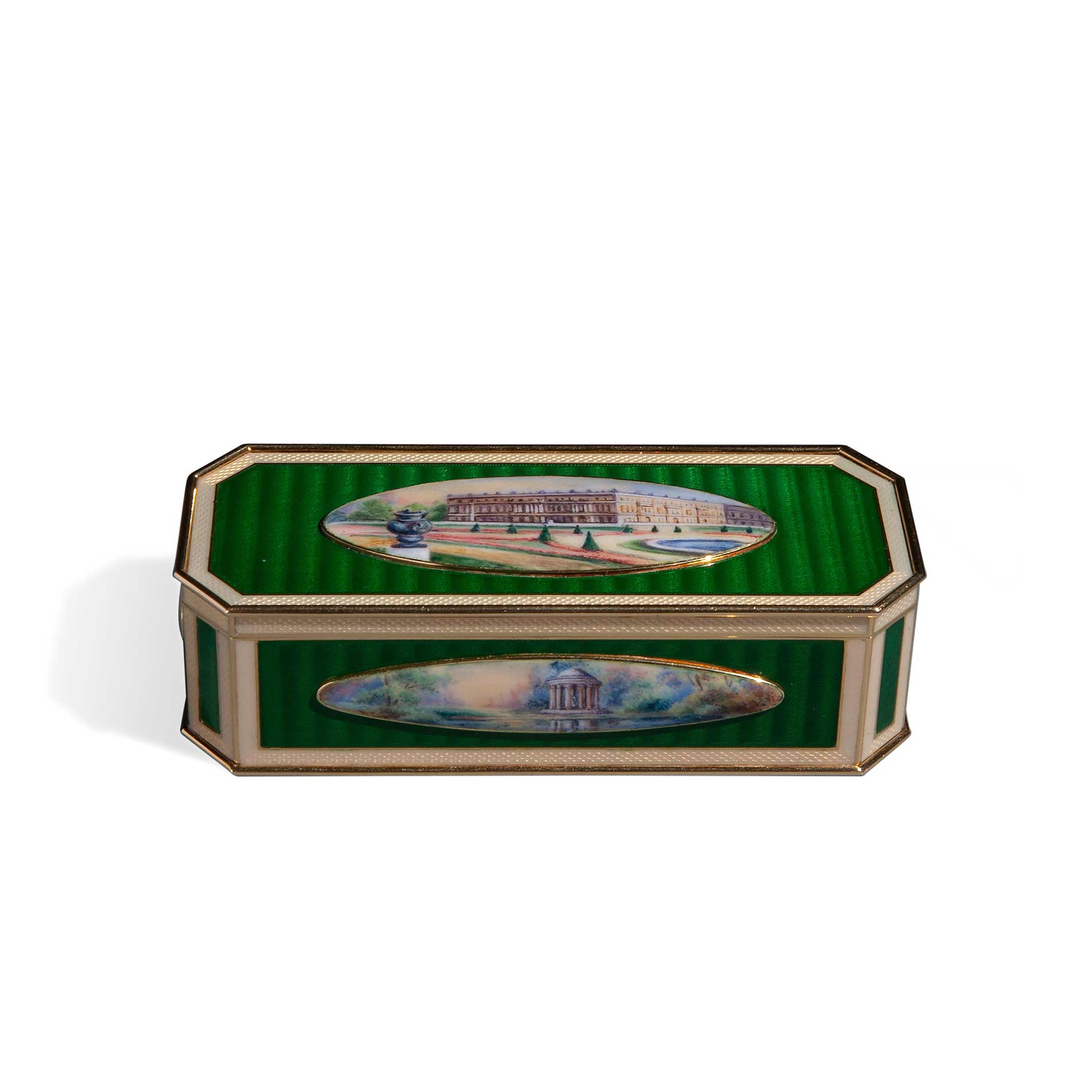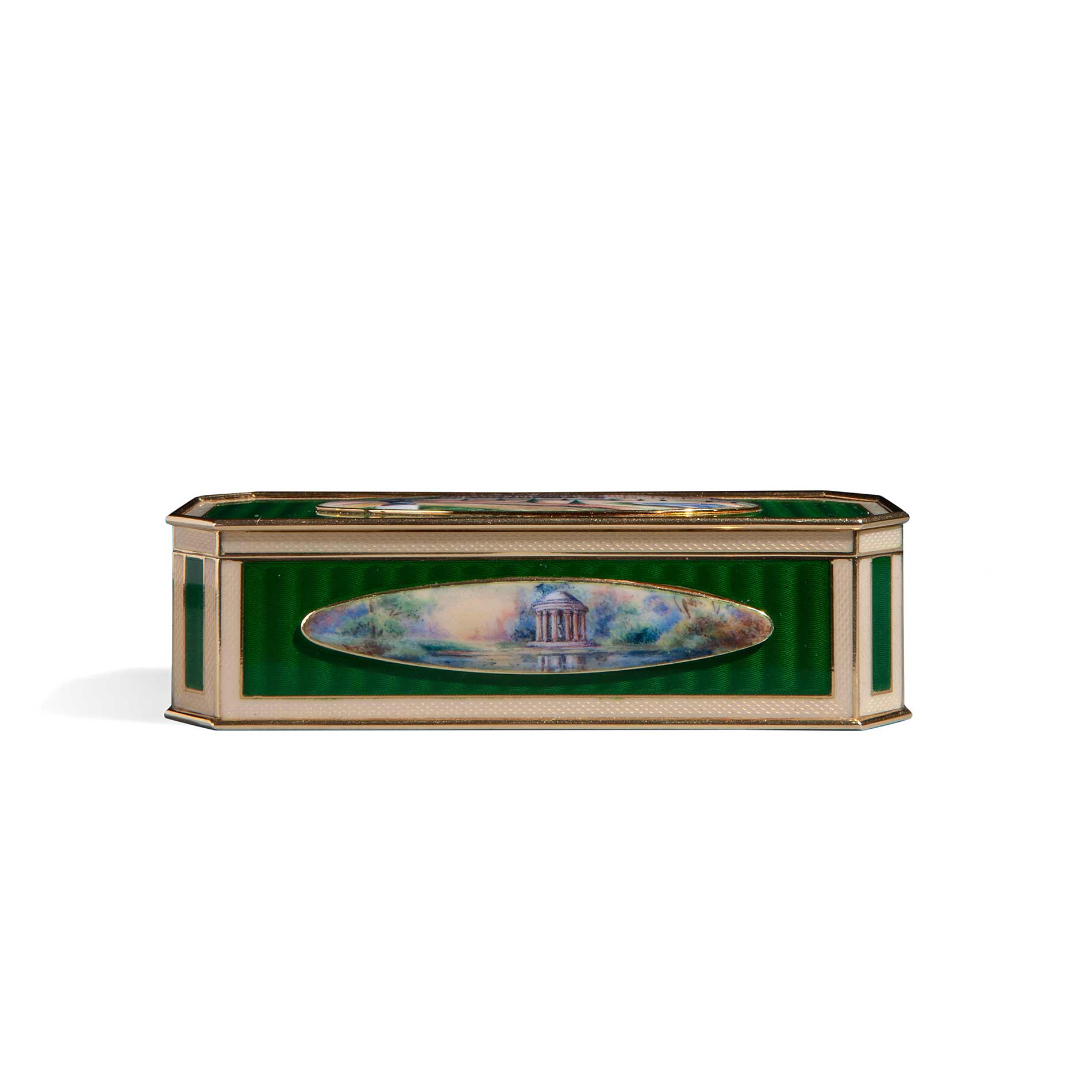 Scatola ottagonale in oro e smalti verdi a fondo guilloché, XIX secolo Vecchia manifattura francese, oro 18 kti, miniatura con scena raffigurante palazzo nobiliare. Peso complessivo gr. 117,3 Larghezza cm. 9,7