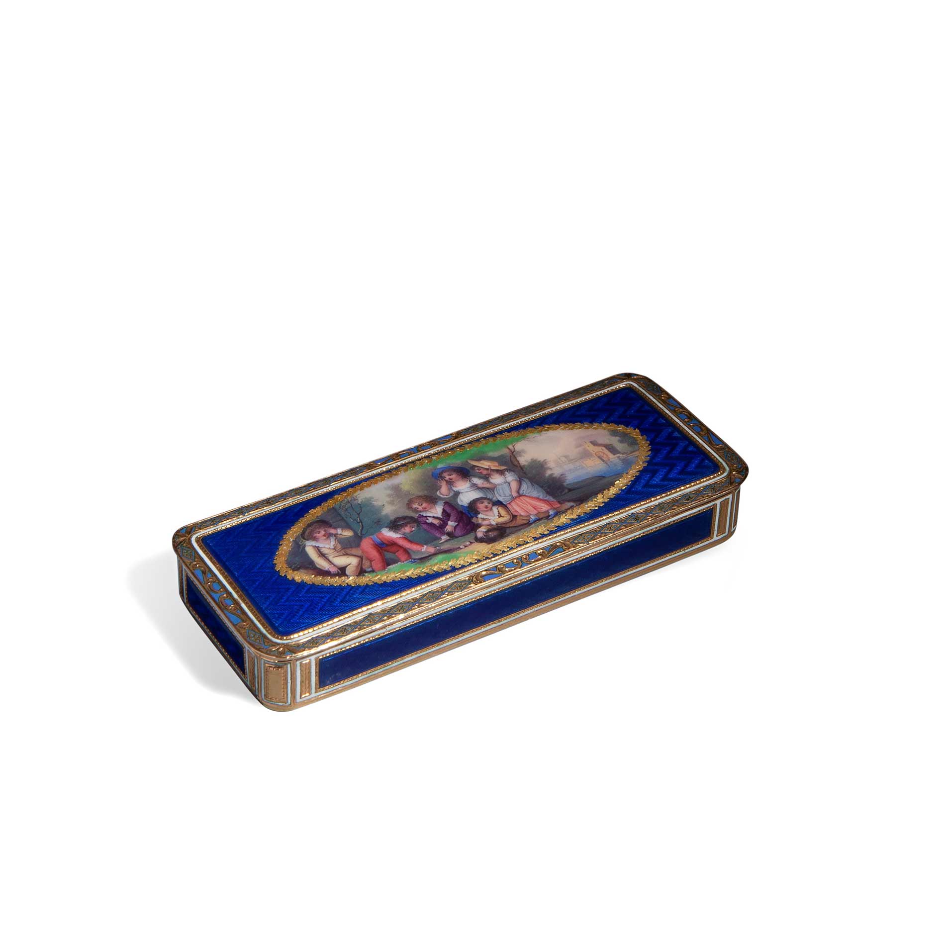Scatola rettangolare in oro e smalti policromi, XVIII secolo Di probabile manifattura francese, la miniatura raffigura dei bimbi che giocano in un peasaggio campestre. Lo smalto blu è a fondo guilloché, oro 18 kti; peso complessivo gr. 71,2 Larghezza