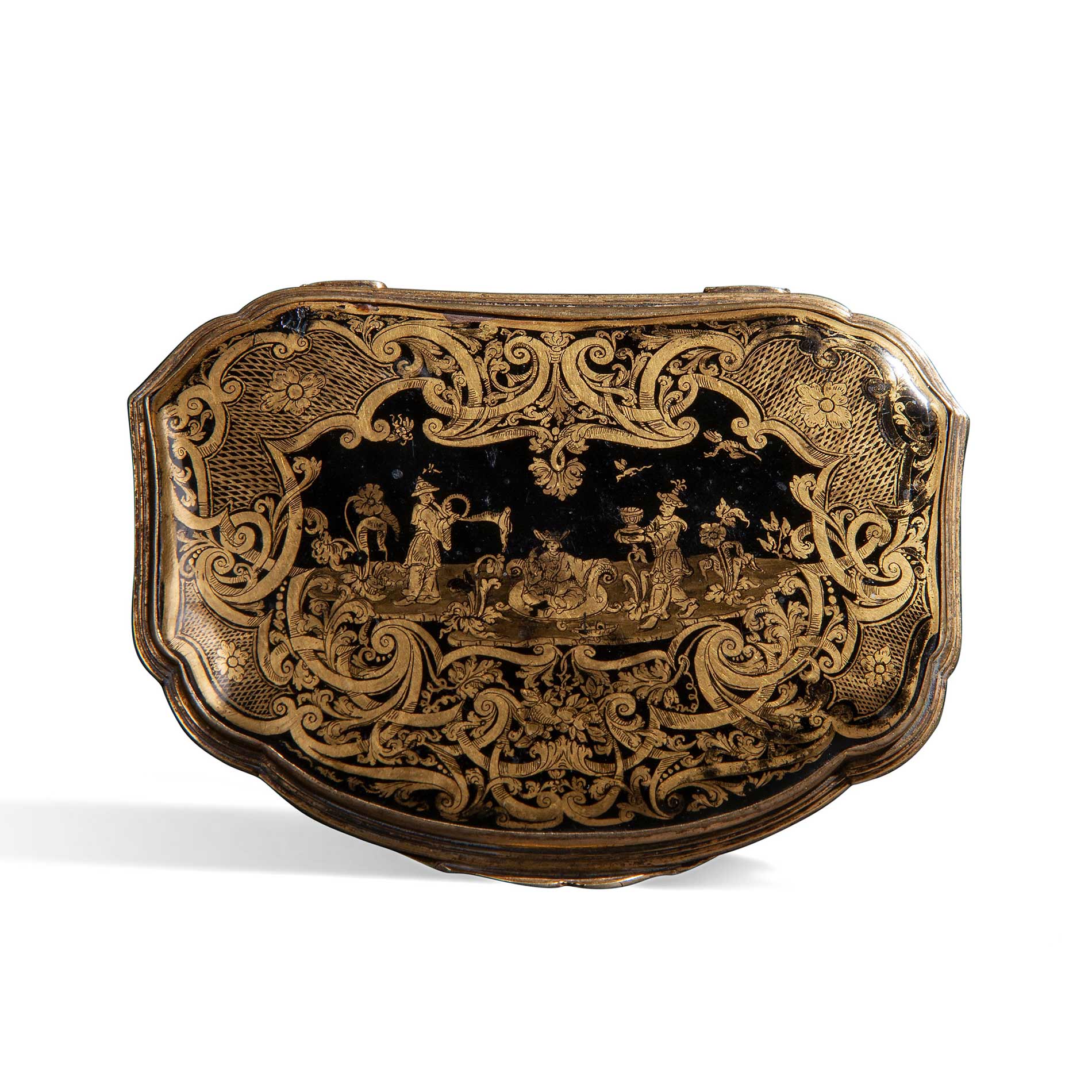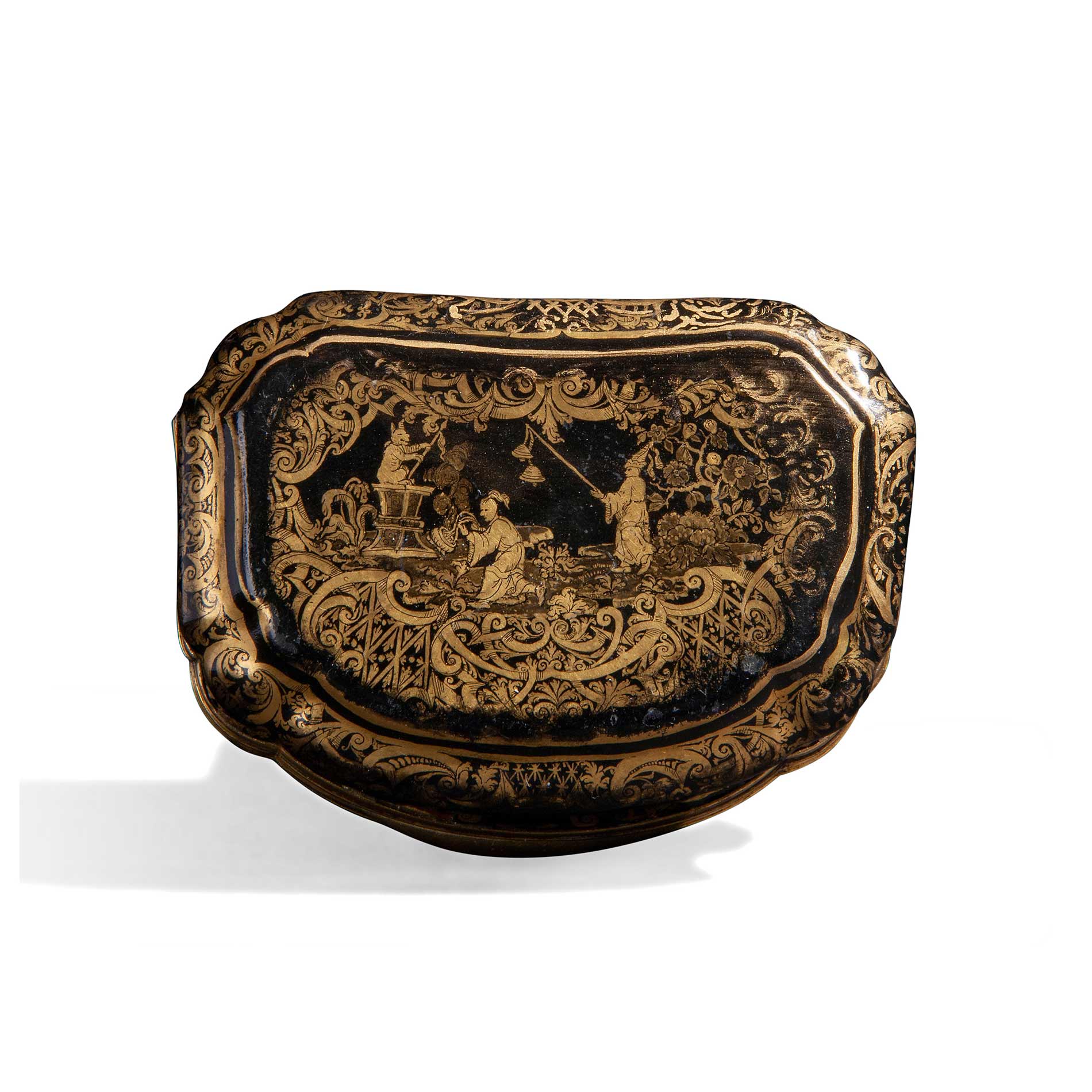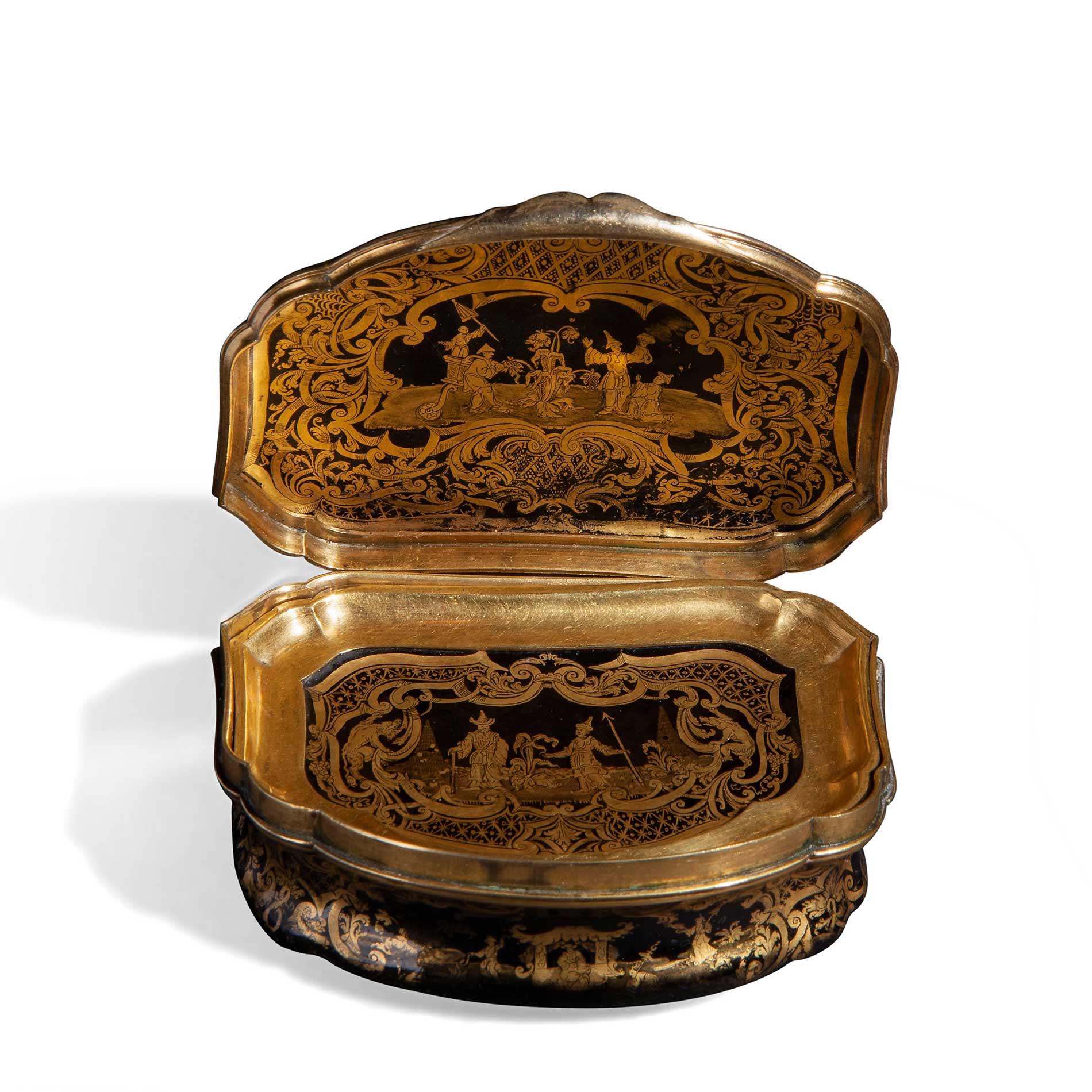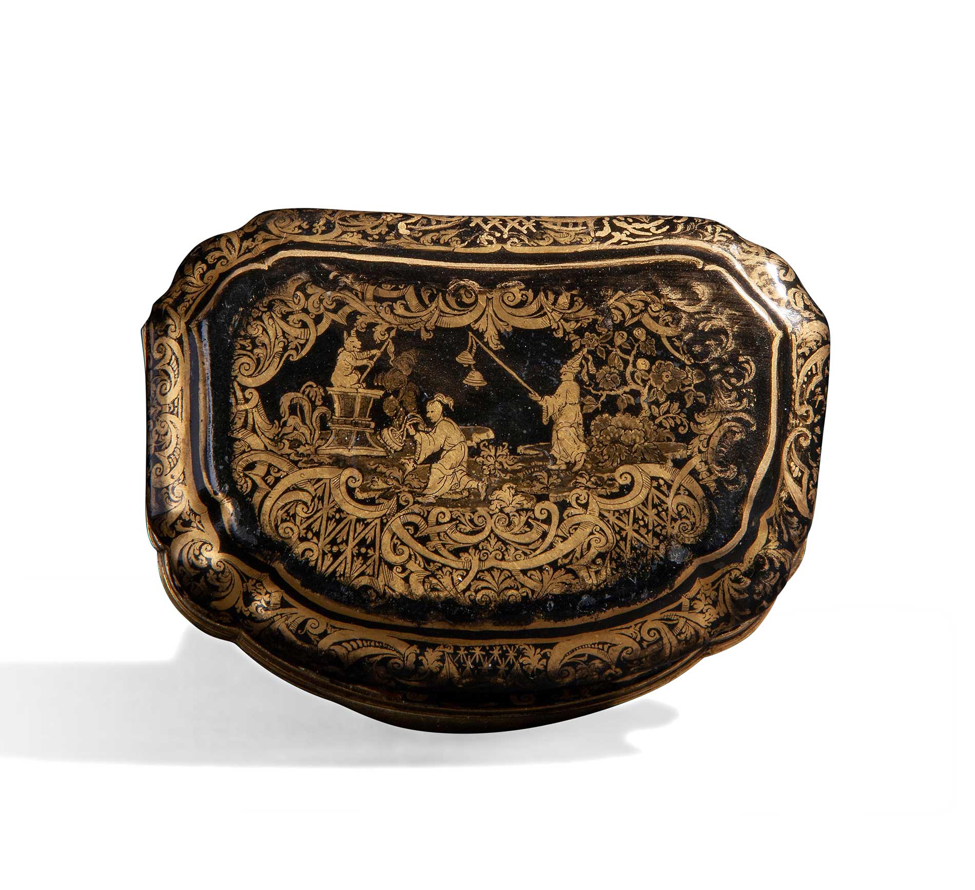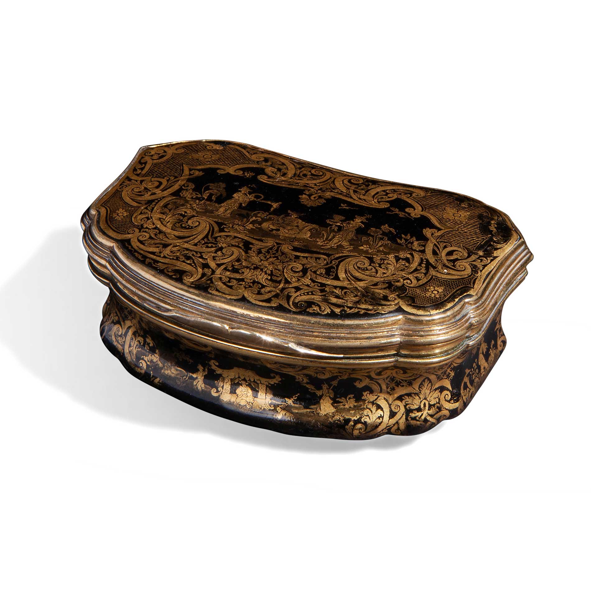 Rara scatola sagomata con vassoio interno di Jean-Jacques Prevost, prima metà XVIII secolo Manufatta in smalto lacca e decorazioni dorate a chinoiserie, montata su metallo dorato. Le scatola è decorata su tutti i lati, compreso il fondo e il vassoio int