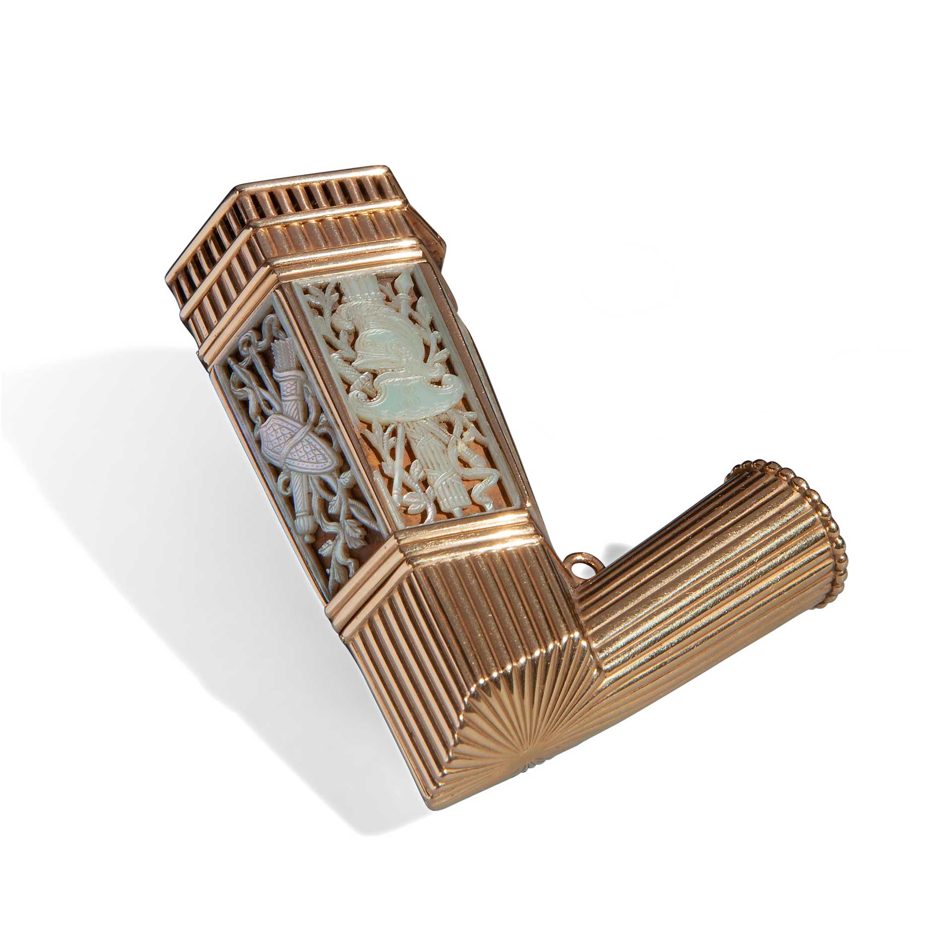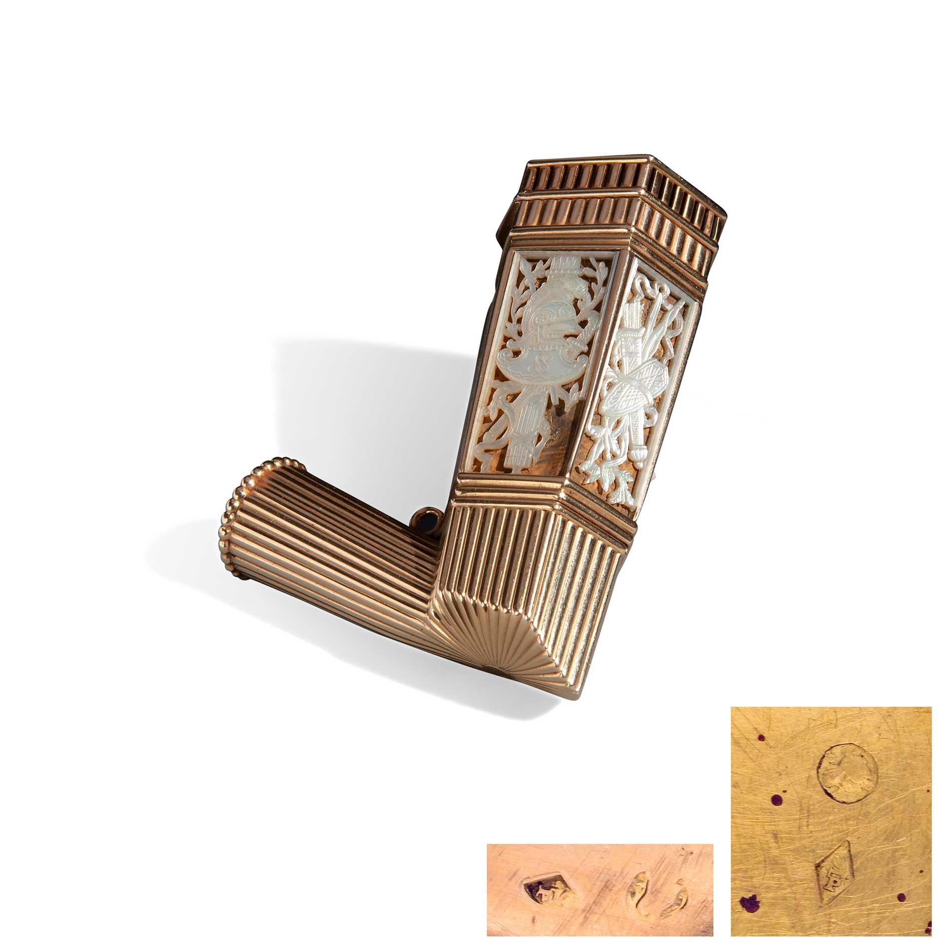 Pipa in oro e madreperla, Parigi 1819 – 1838 Decori in madreperla con raffigurati attributi militari, oro 18 kti. Orefice C. P. Petschler, con astuccio originale in galuchat Altezza cm. 8,3 larghezza cm. 3