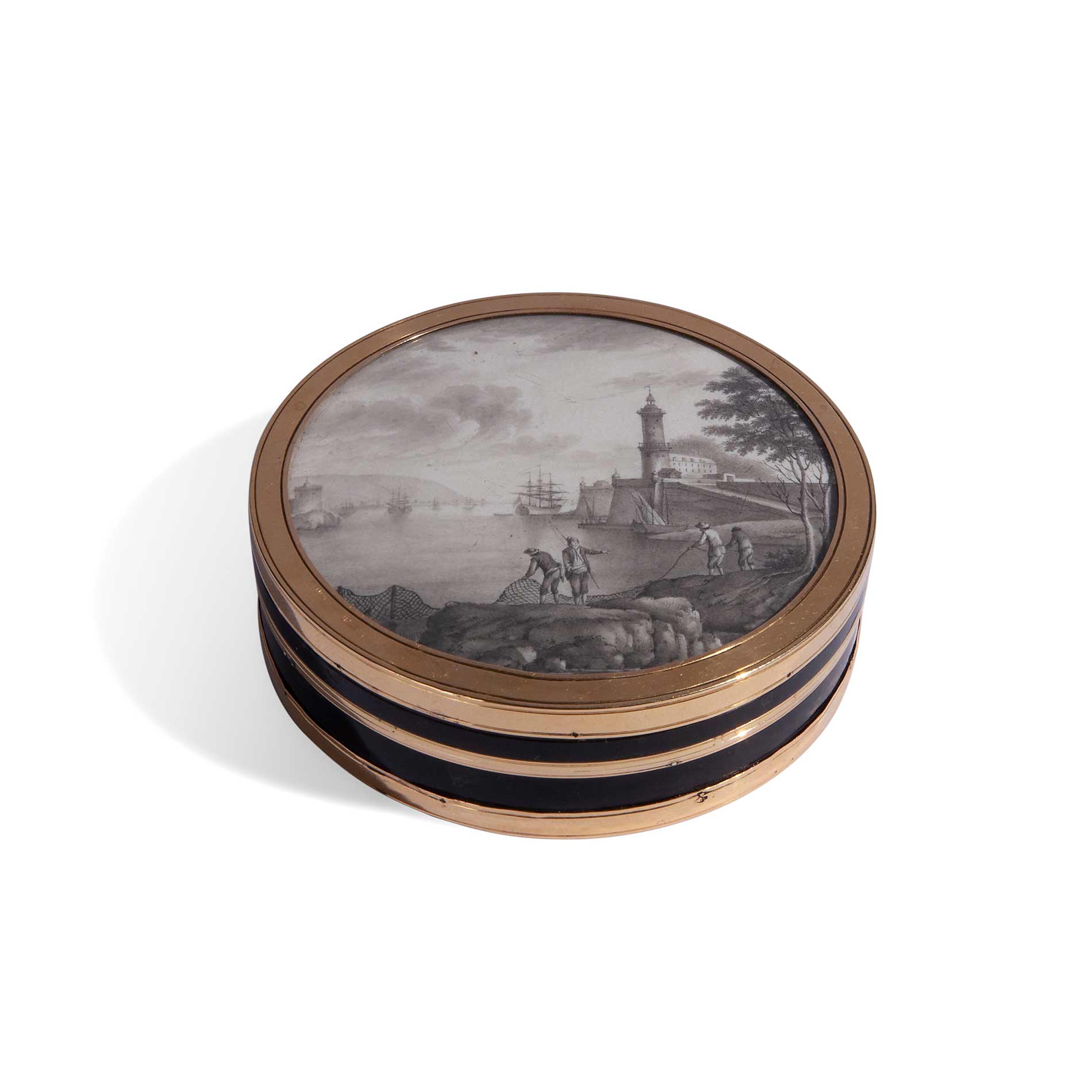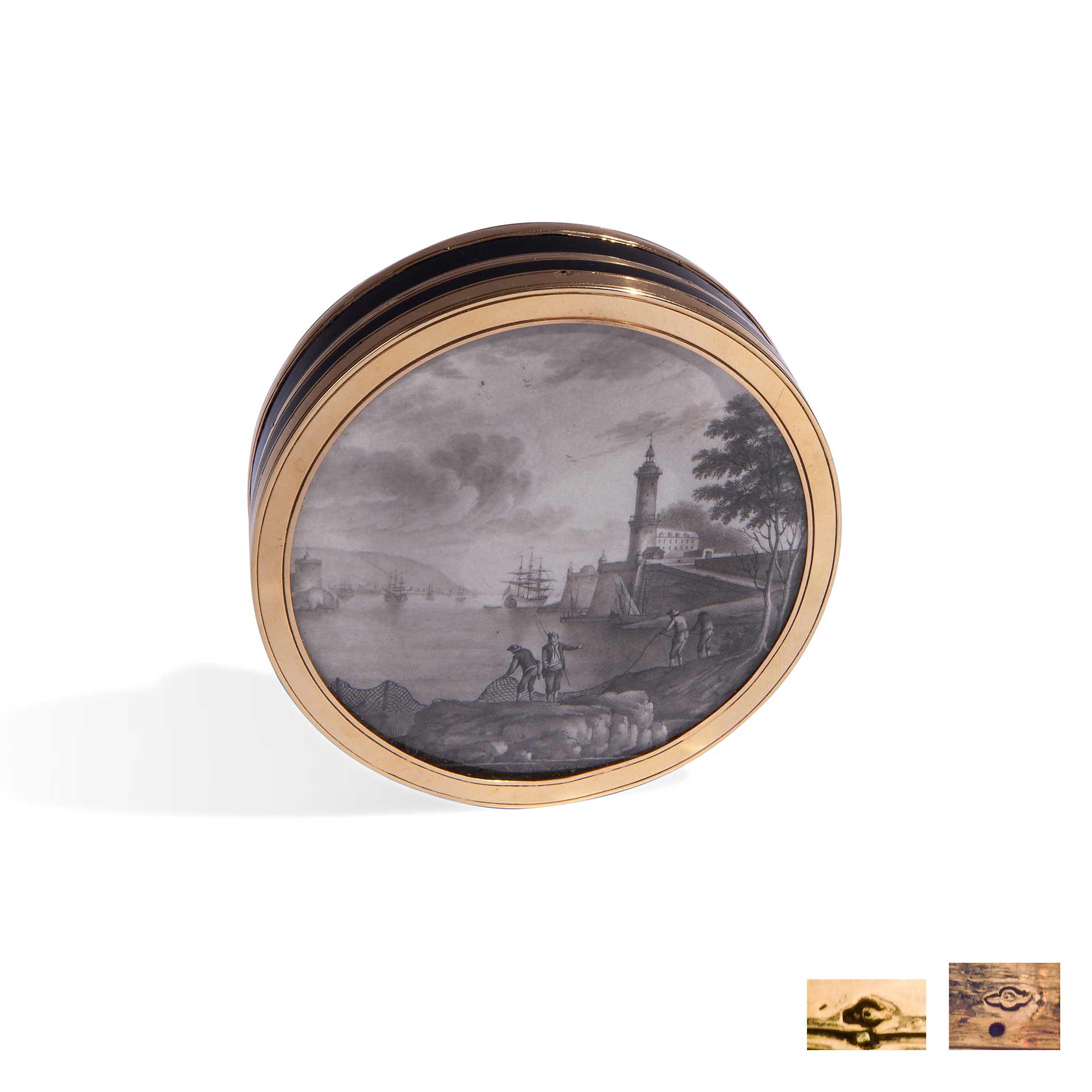 Grande scatola tonda con cornici in oro e miniatura, 1770- 1780 Probabile manifattura francese, miniatura raffigurante scena portuale, oro 18 kti Diametro cm. 8,4