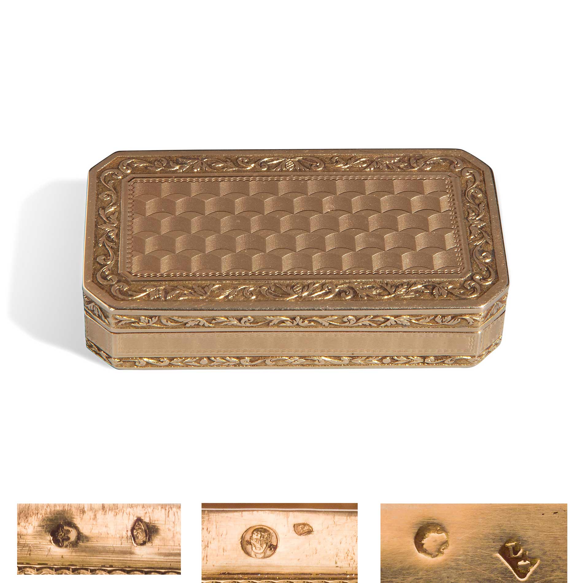 Tabacchiera di forma ottagonale allungata in oro cesellato, Parigi 1798 - 1809 Impressa una sequenza di punzonature molto interessanti e in sequenza temporale: bollo post-rivoluzionario non ufficiale in uso dal 1798 per il titolo a 18 kti; bollo di picc