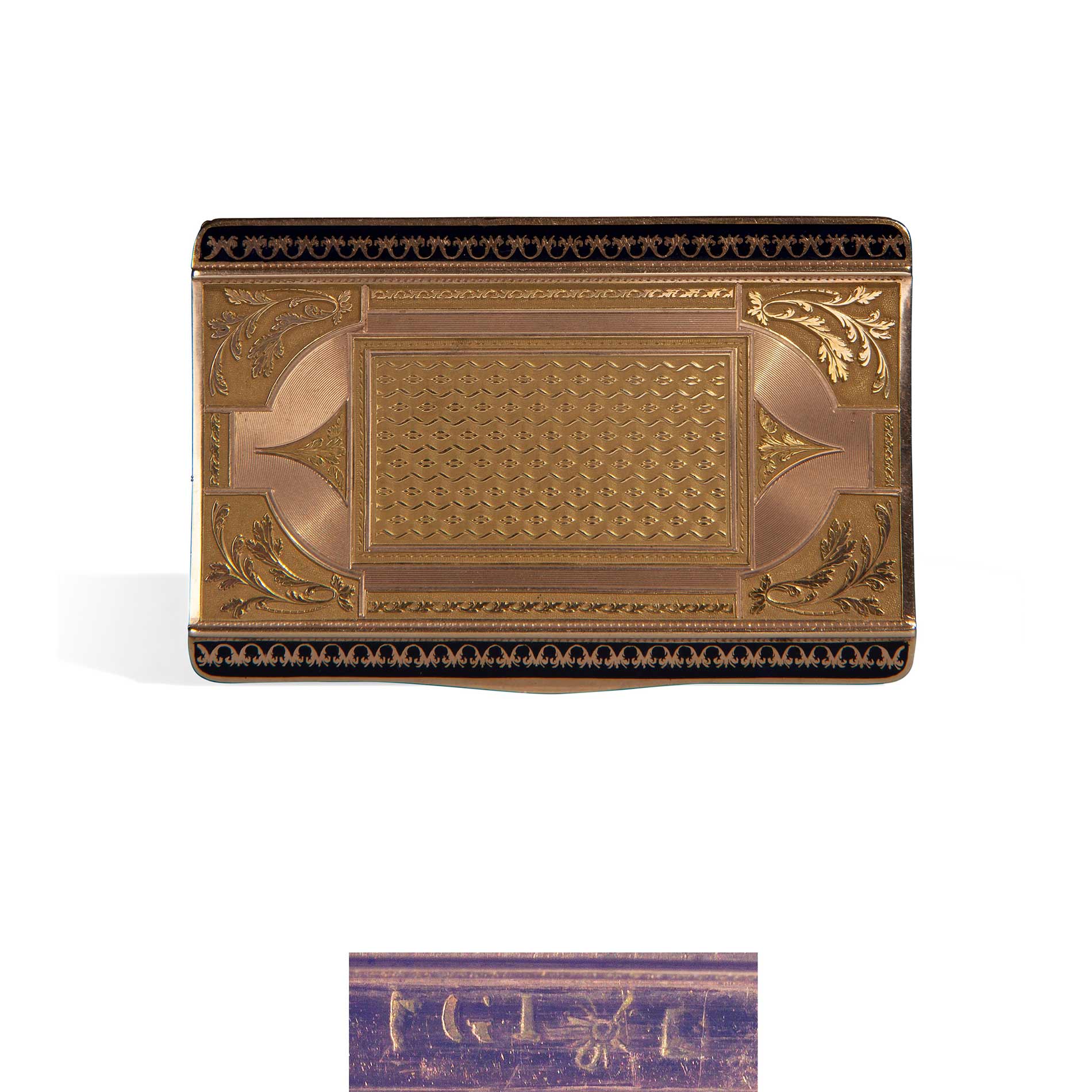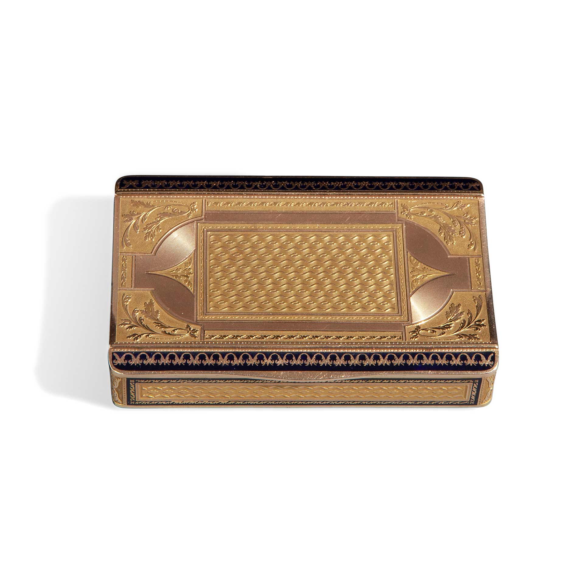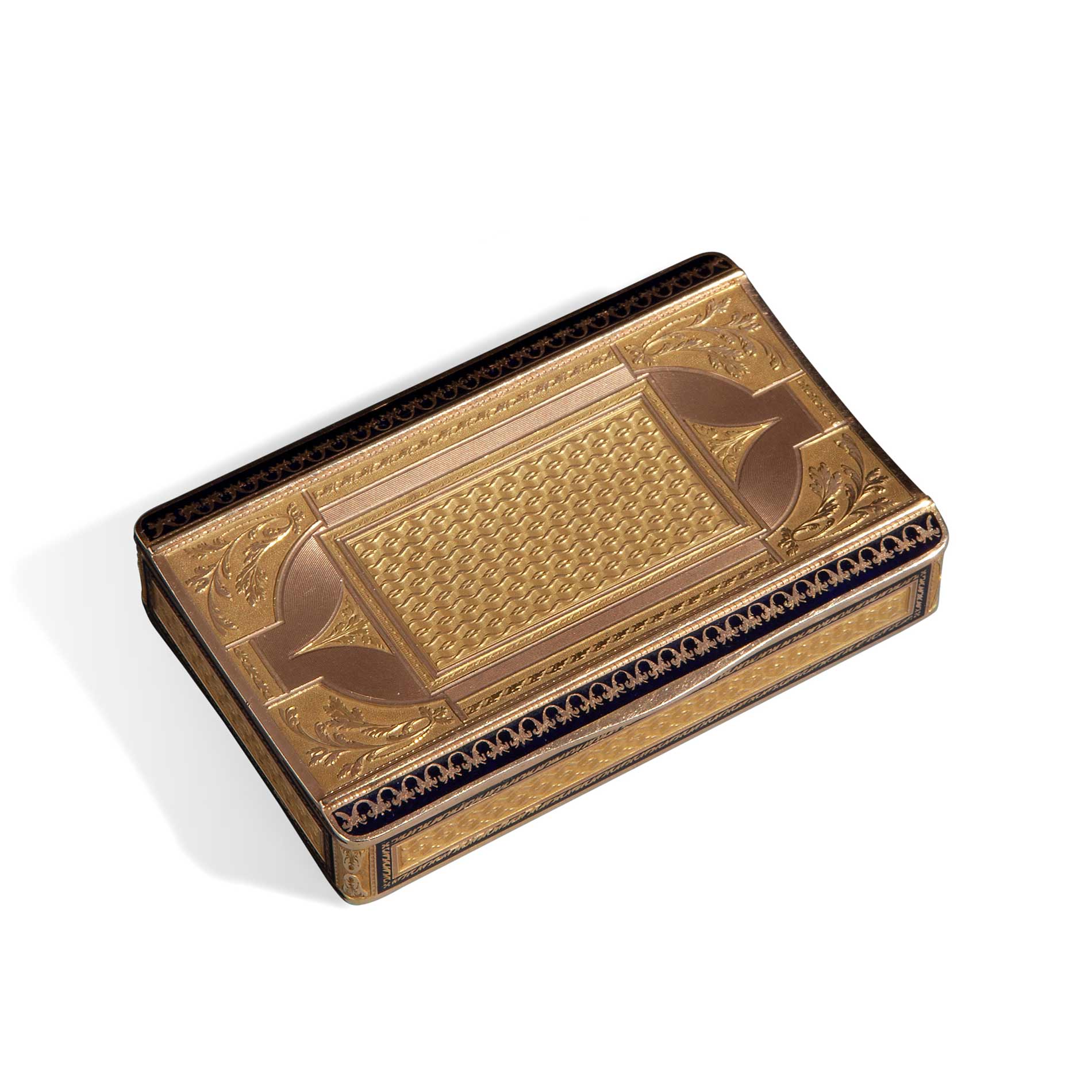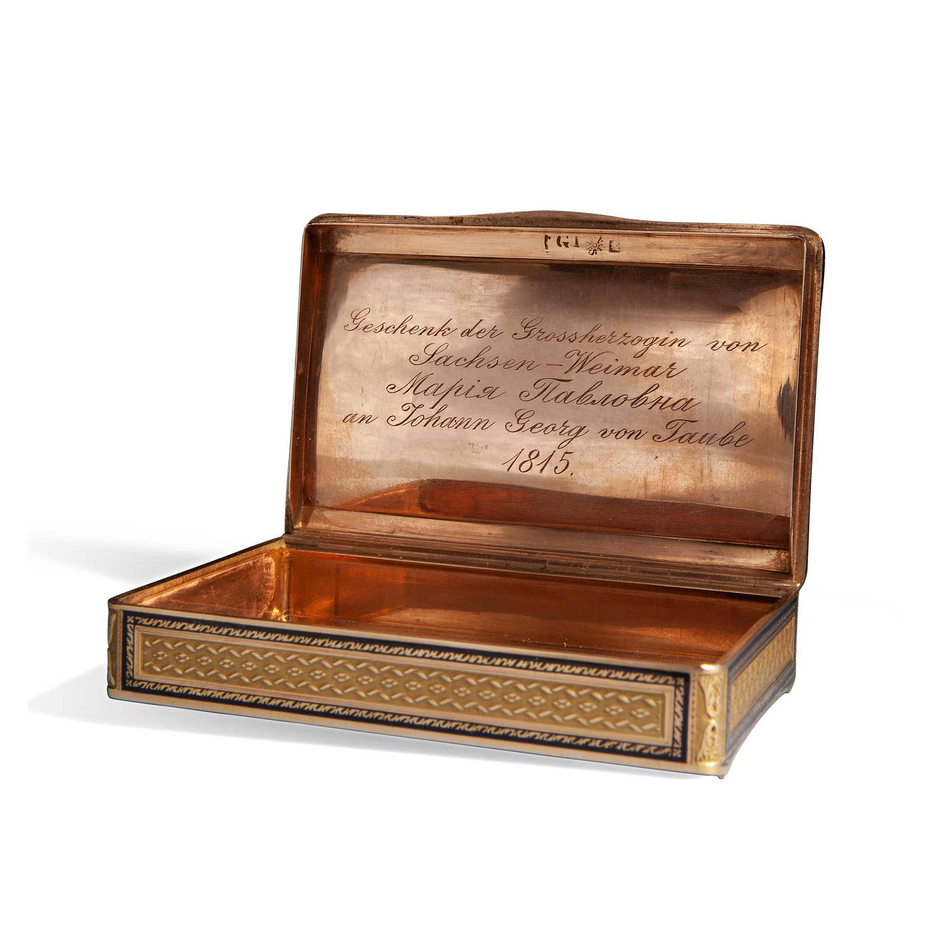 Tabacchiera rettangolare in oro cesellato Manifattura mitteleuropea oro 18 kti, peso complessivo gr. 87,9. La scatola è stata donata della graduchessa di Sassonia-Weimar Maria Pavlovna a Johann Georg Von Taube nel 1815. Maria Pavlovna era la figlia dell