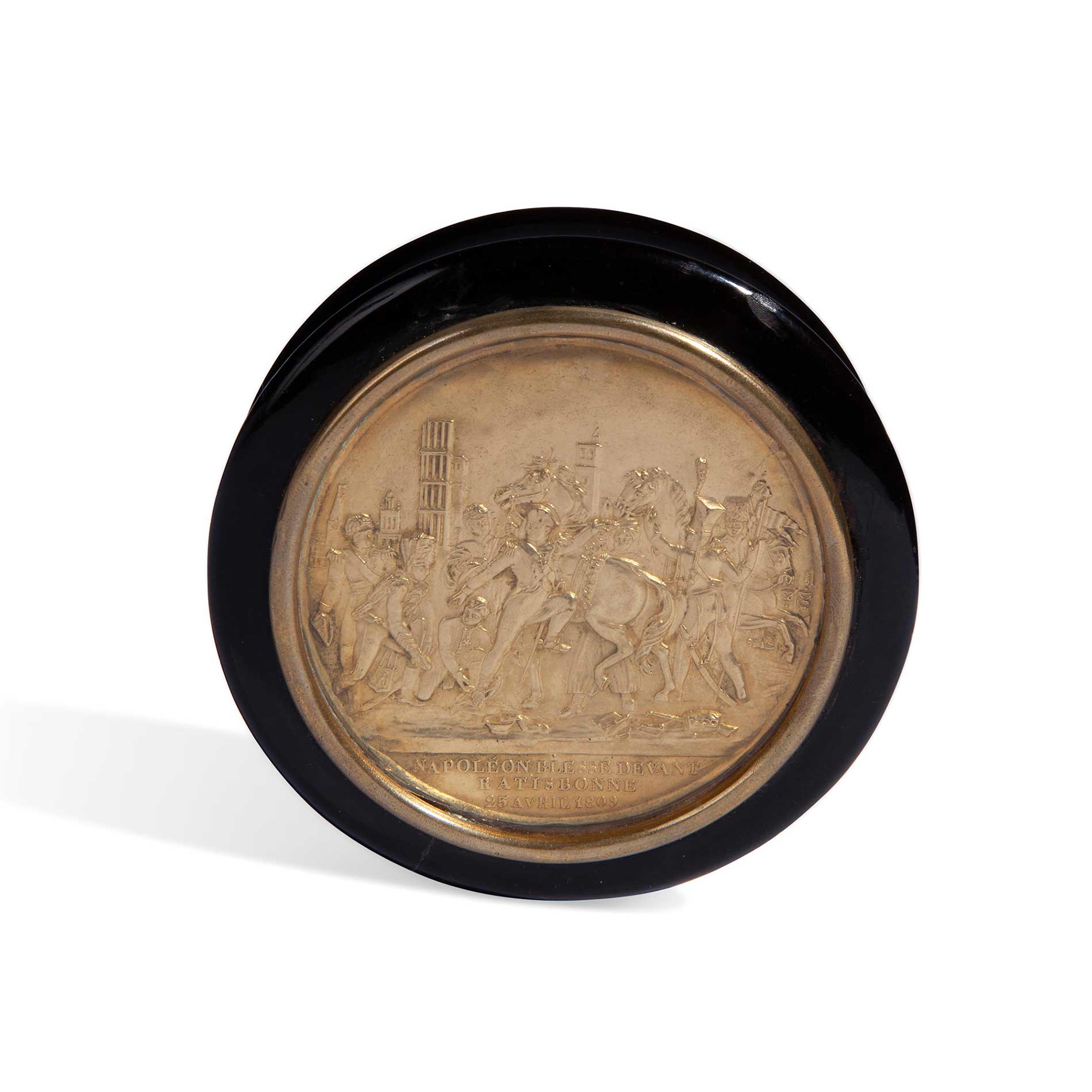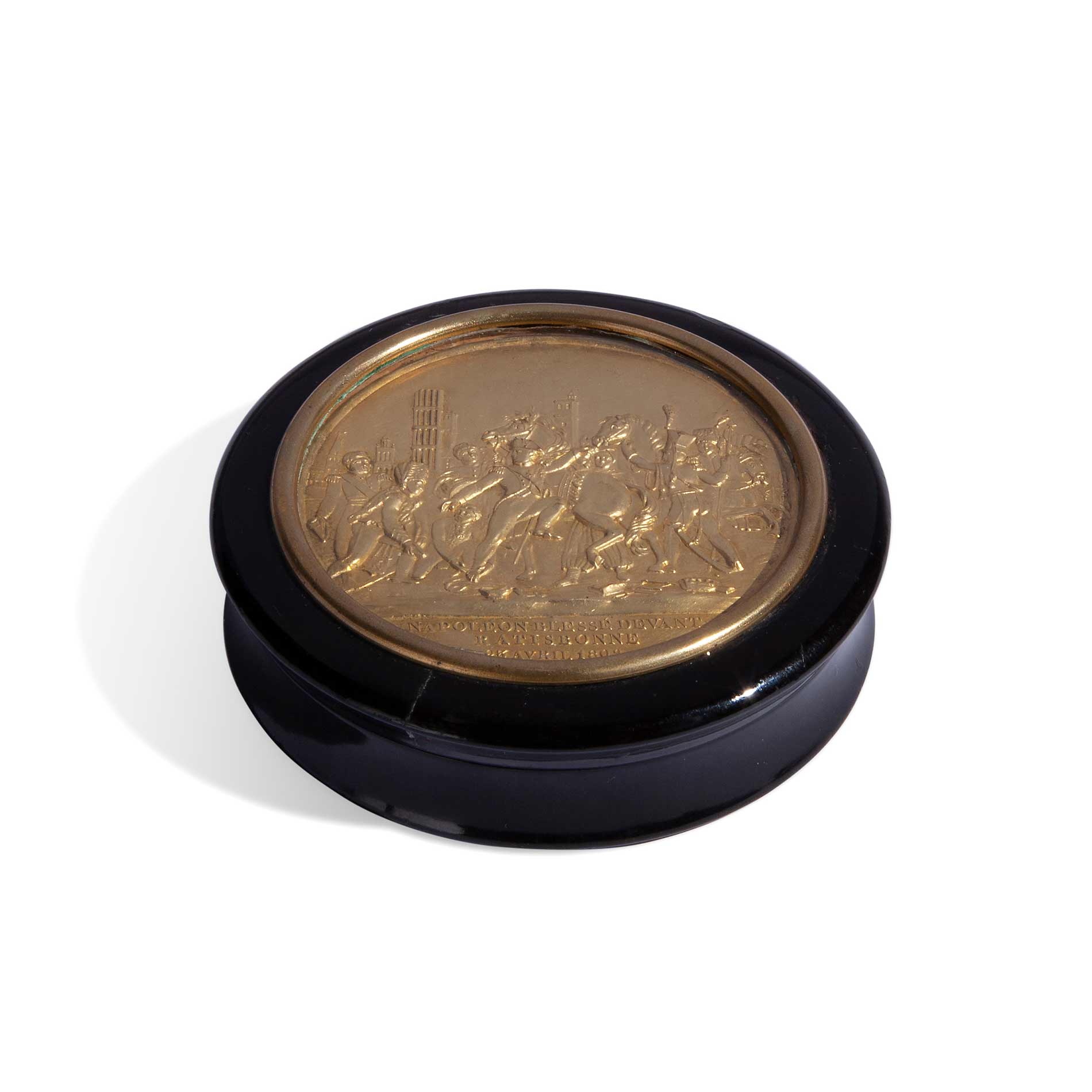 Scatola tonda con inserti in oro, manifattura francese Placca centrale sbalzata in oro 18 kti raffigurante Napoleone a Ratisbona, provenienza francese del 25 aprile 1809 Diametro cm. 9,4