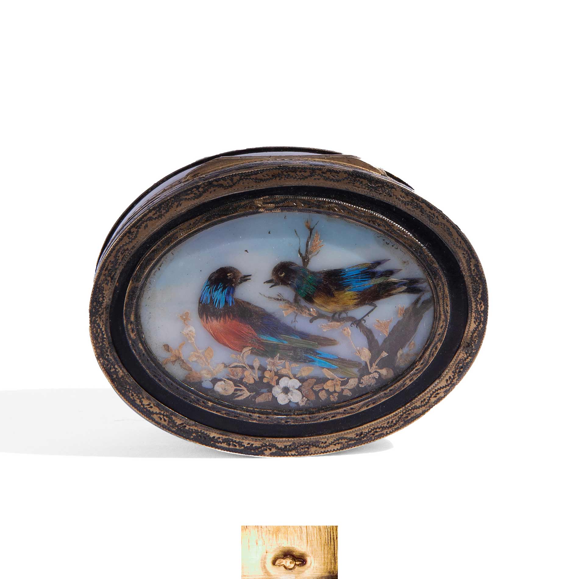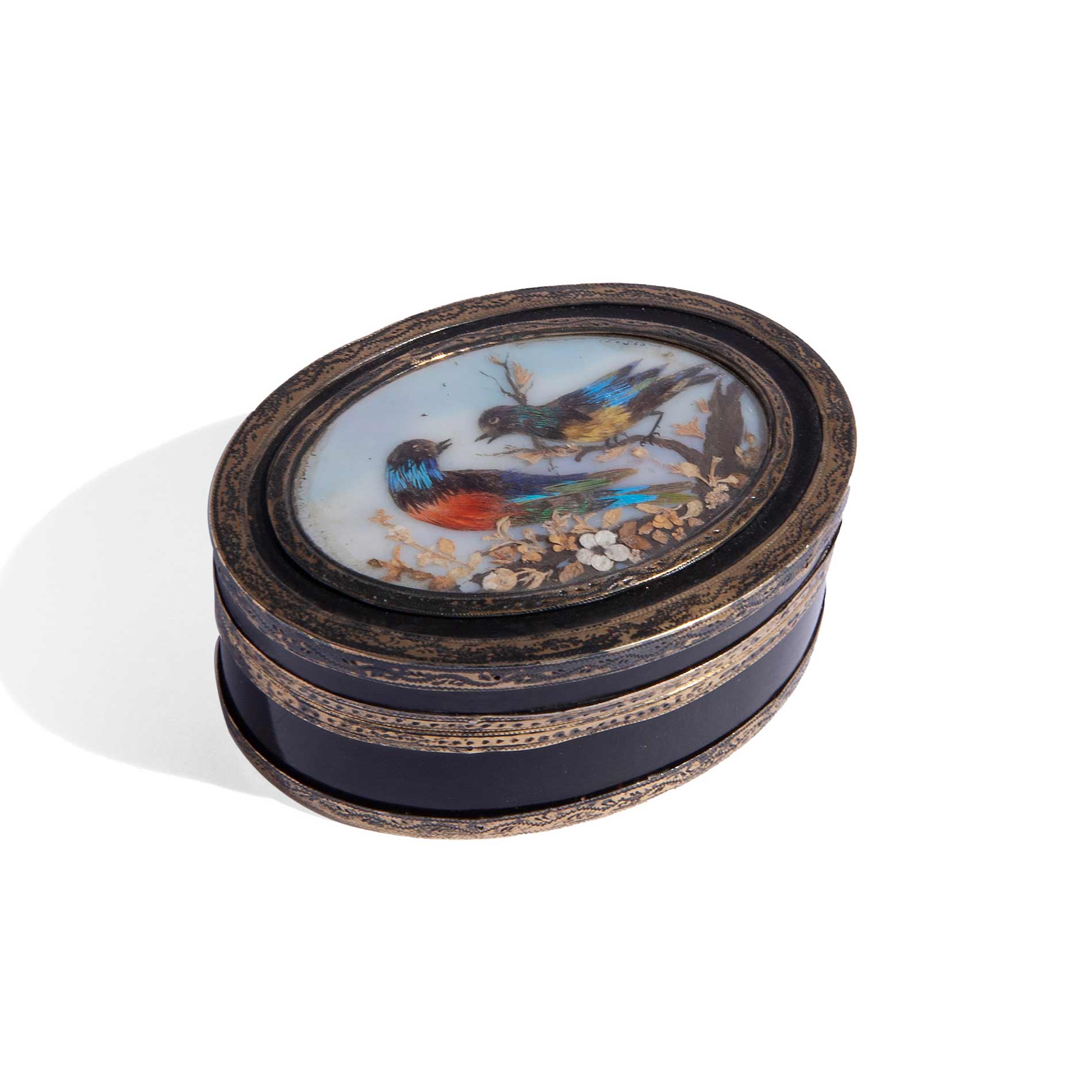 Scatola ovale in tartaruga, argento dorato e miniatura, XIX secolo Manifattura francese, miniatura raffigurante due uccelli realizzati da piume vere Larghezza cm. 7,8
