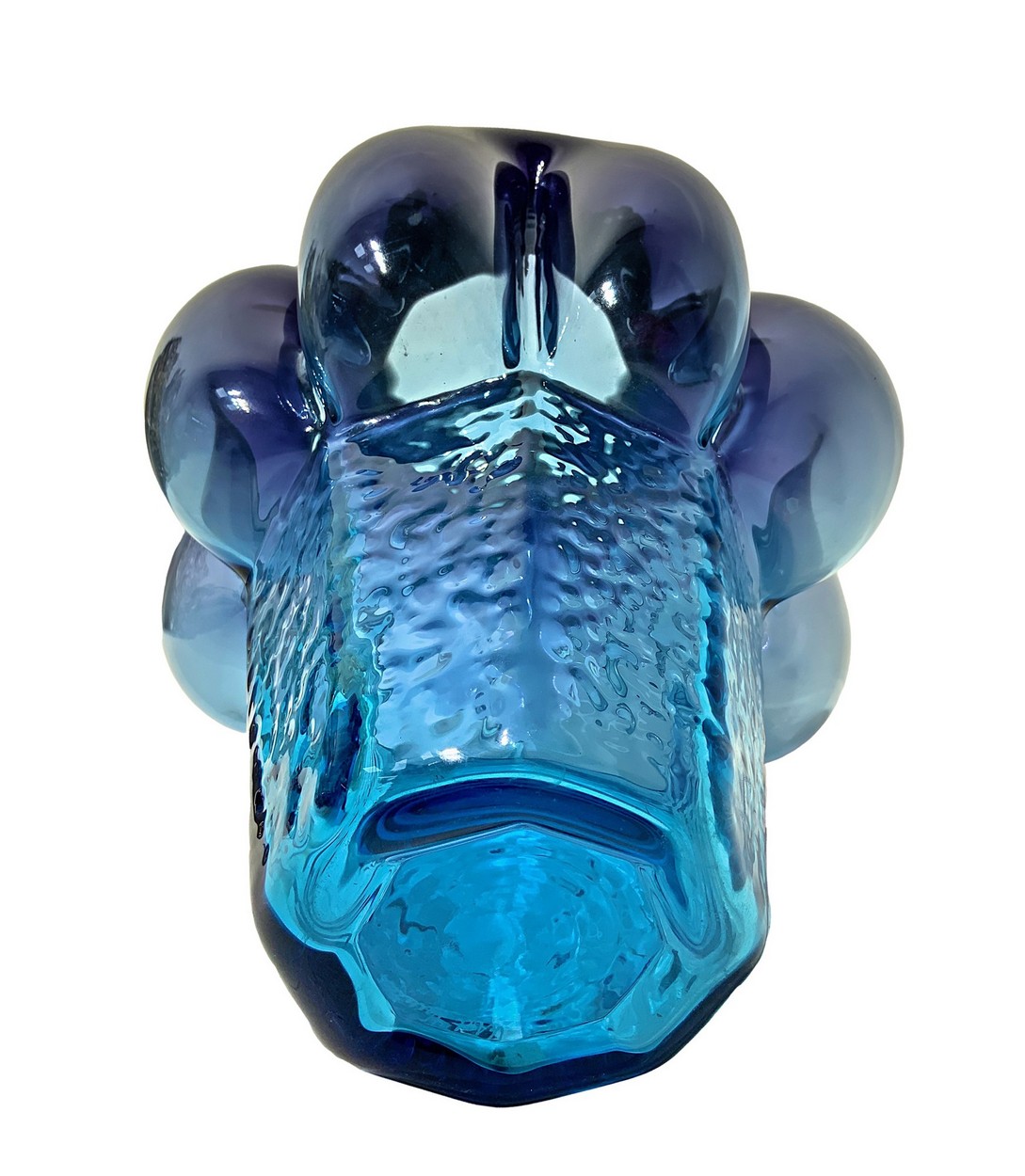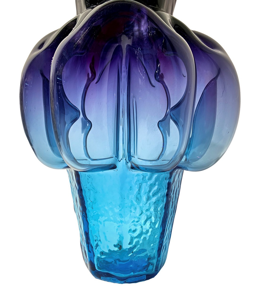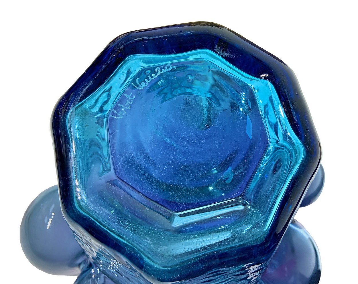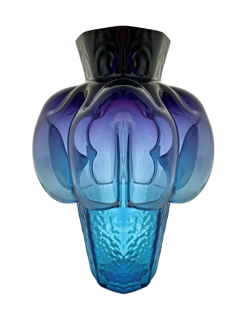 Collo di forma esagonale lievemente estroflessa corpo di forma globulare irregolare base esagonale in vetro ghiacciato, colorazione a sfumare dai toni del nero all’azzurro, etichetta della manifattura in alto con firma Veart.