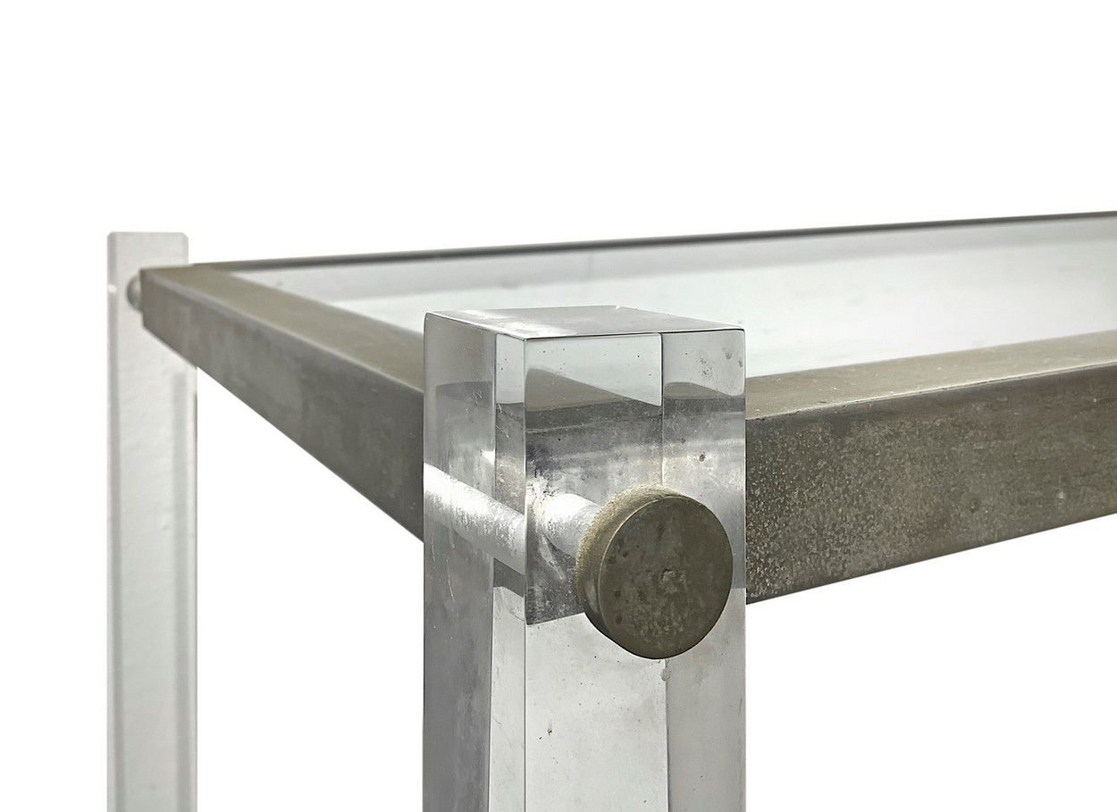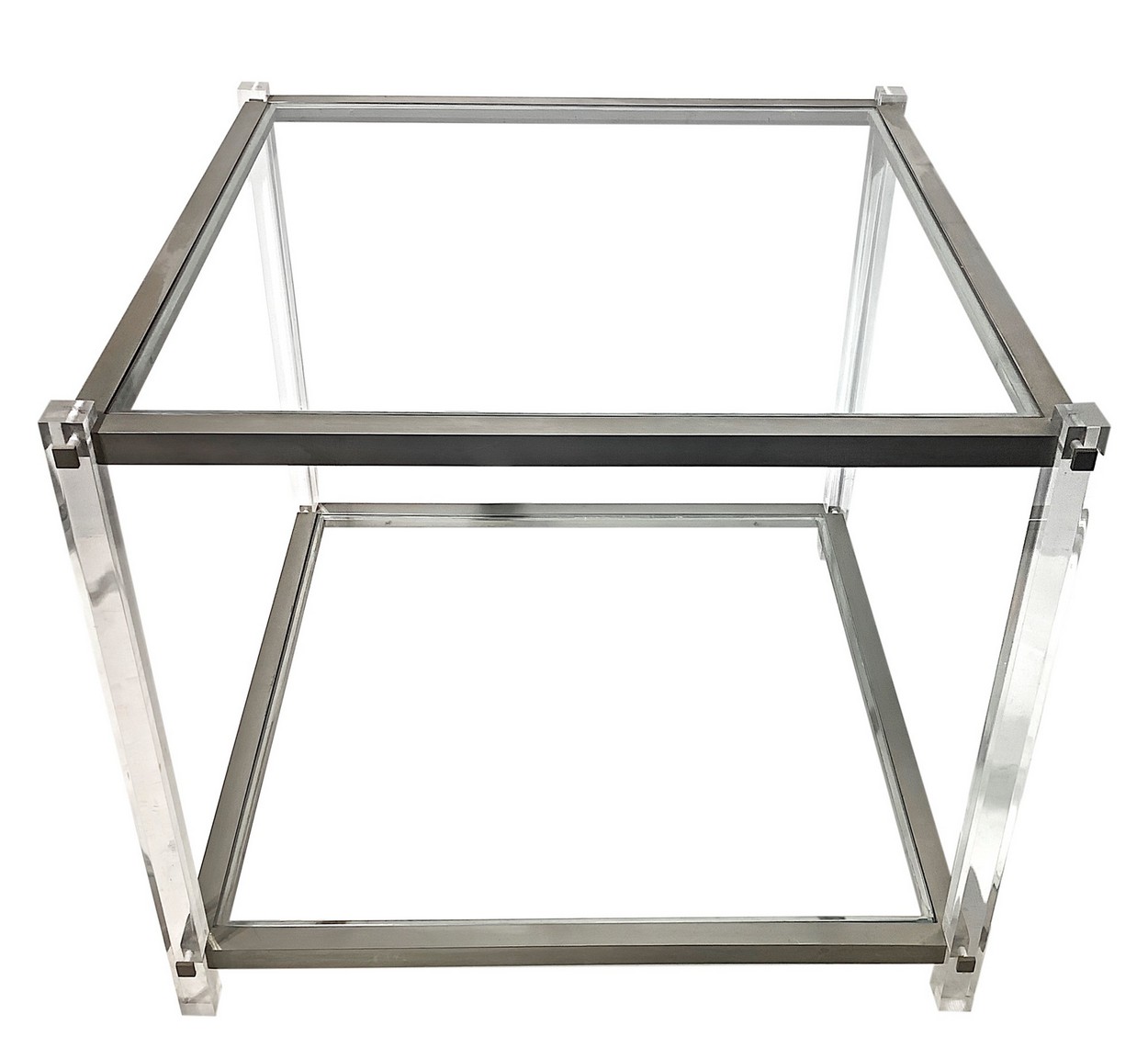 Tavolino rettangolare a due piani, 70's con doppio vetro, struttura in ottone nichelato e lucite, minime tracce di ossidazione, segni di uso. Produzione italiana.con doppio vetro, struttura in ottone nichelato e lucite, minime tracce di ossidazione, segni di uso. Produzione italiana.