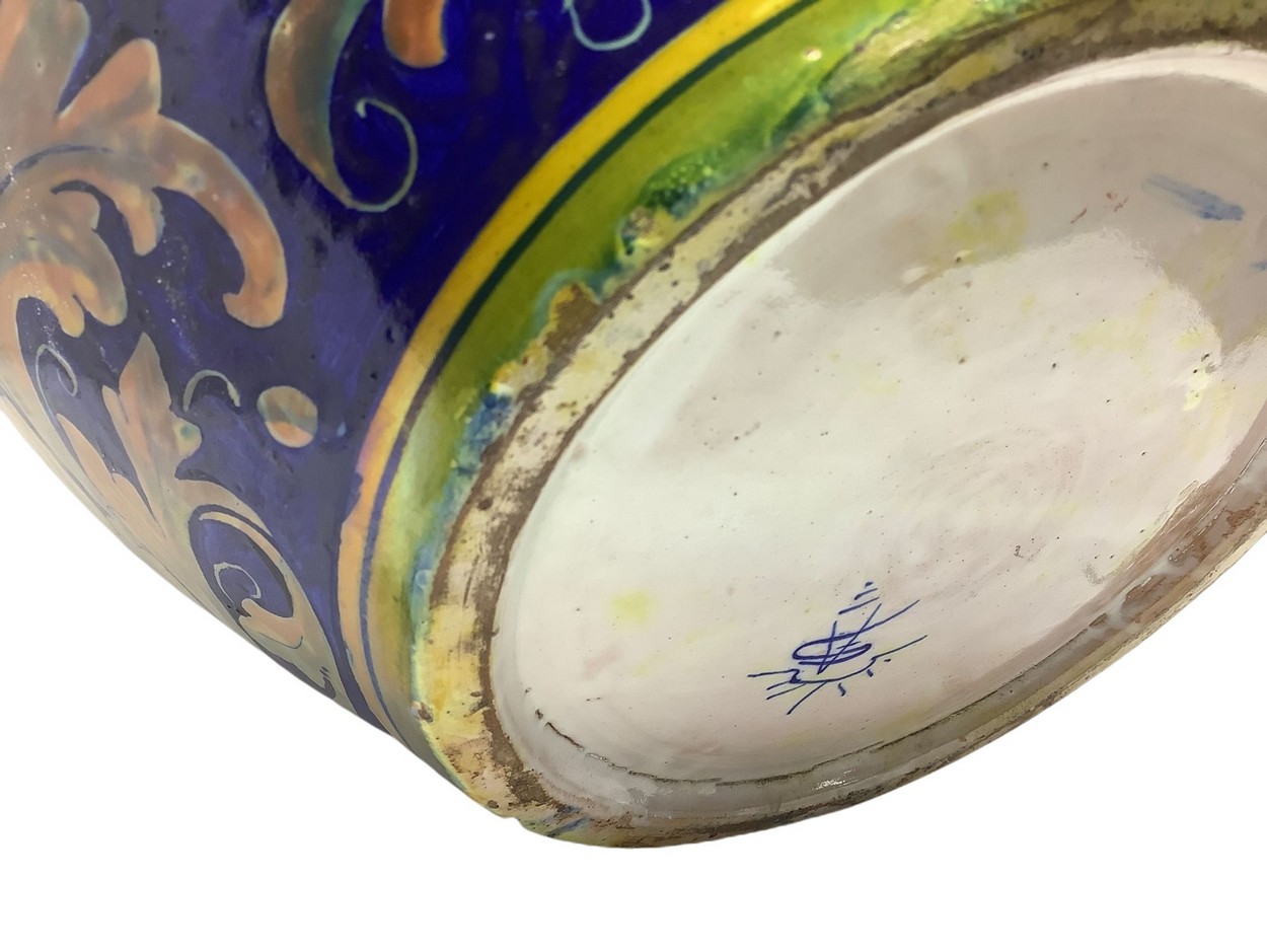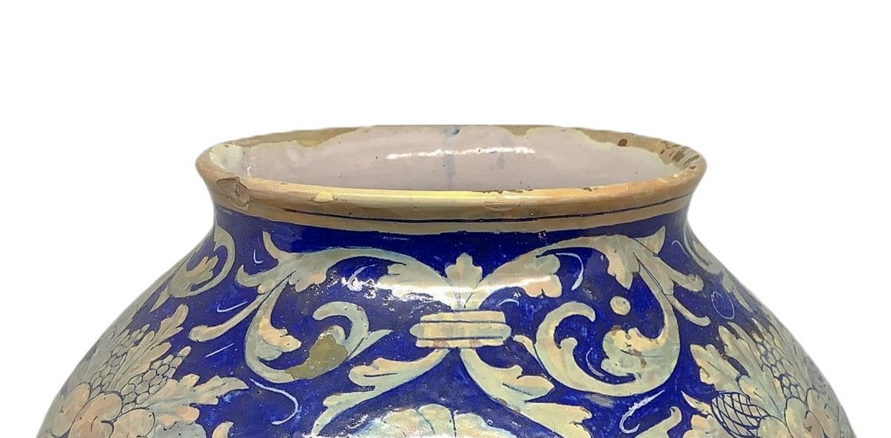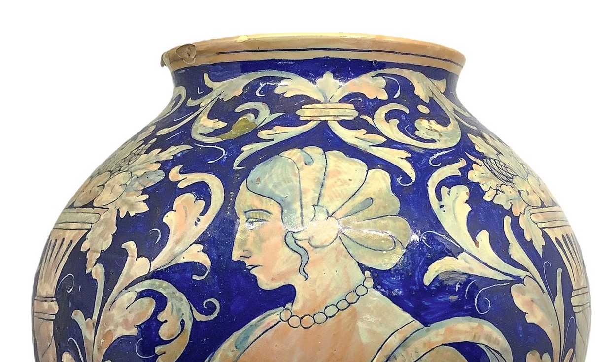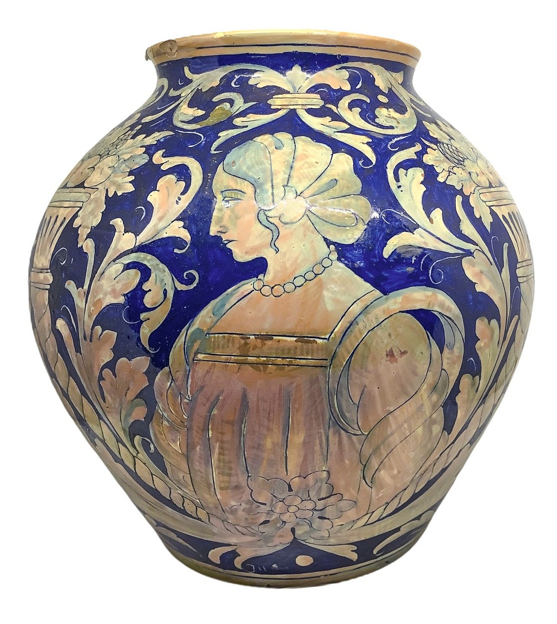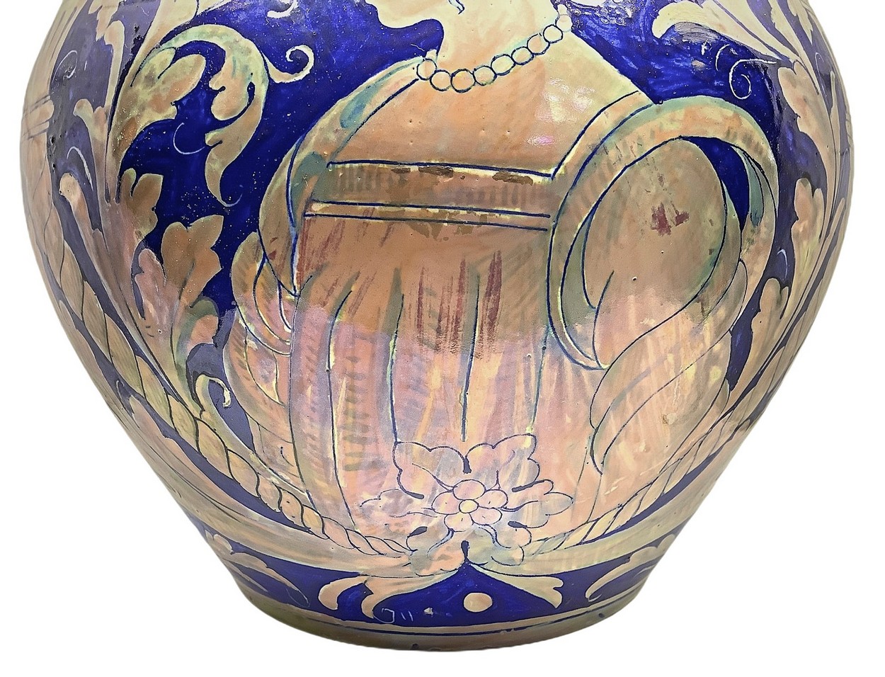Alfredo Santarelli (Gualda Tadino 1874-Gualda Tadino 1957) - Vaso, First half of the 20th century h 25x15 cm Marcato con monogramma AS coronato sul fondo. A lustro, con decoro di foglie d'acanto e profilo di donna su fondo blu.Marcato con monogramma AS coronato sul fondo. A lustro, con decoro di foglie d'acanto e profilo di donna su fondo blu.