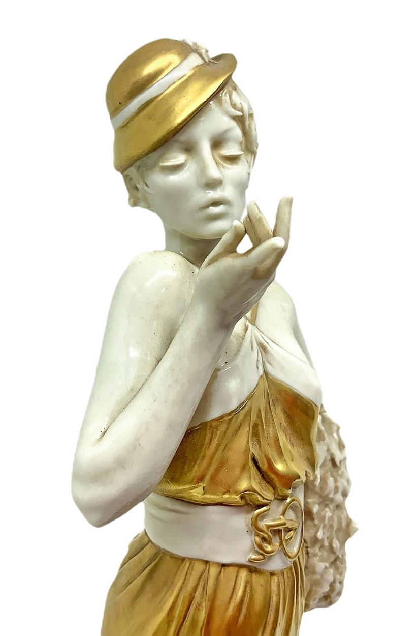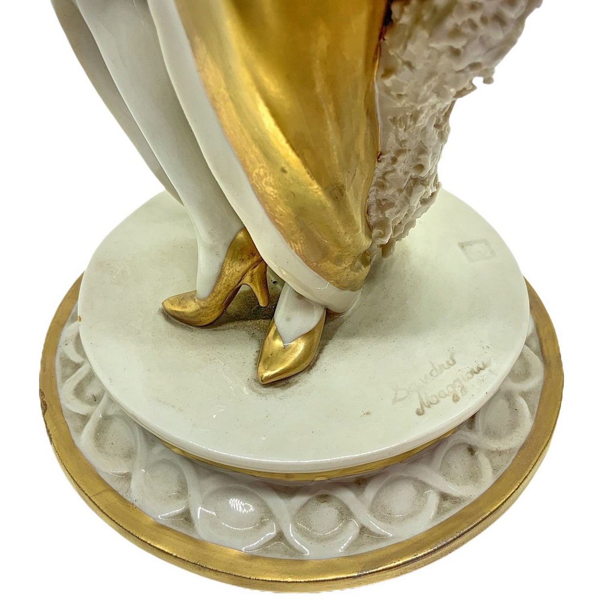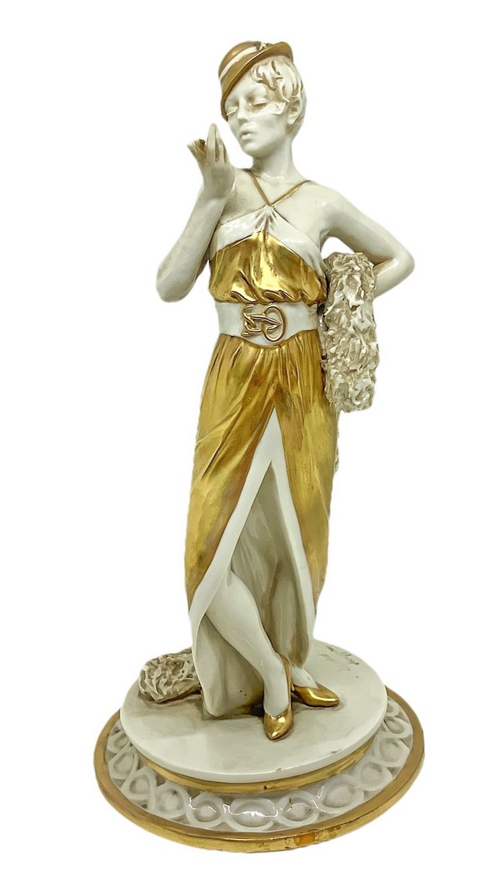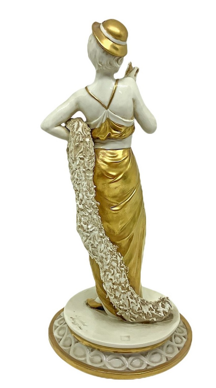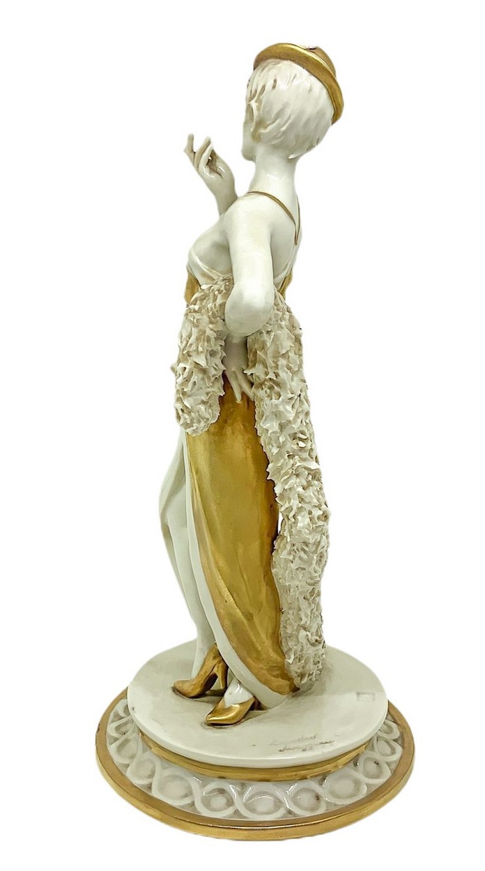Capodimonte, statuetta in porcellana raffigurante donna con cappello e stola in pelliccia H cm 23, base cm 11 nei colori del bianco ed oro.nei colori del bianco ed oro.