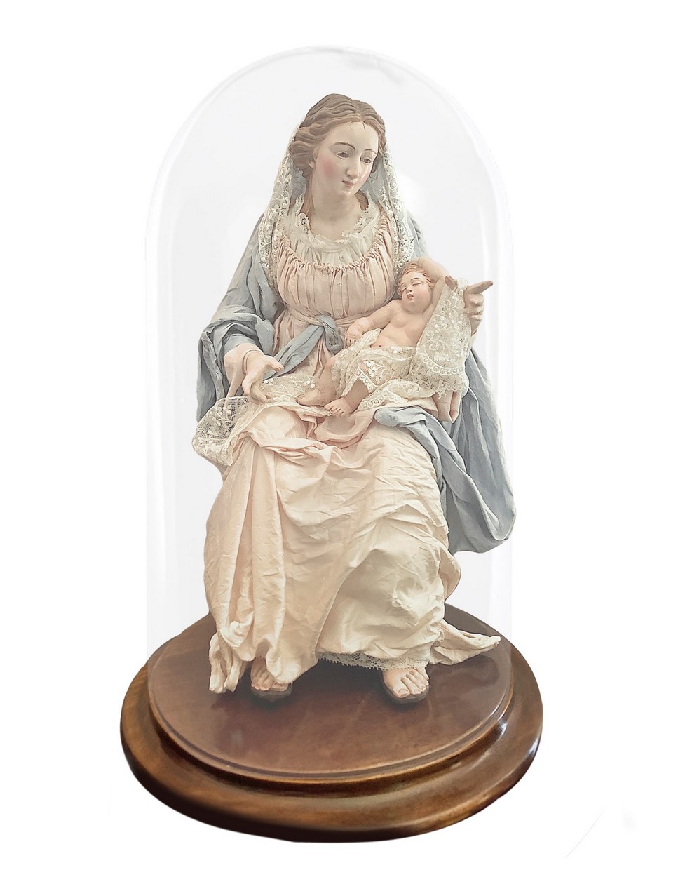 Aniello Gaudino (Torre del Greco) - Natività in teracotta raffigurante Madonna con Bambino H 34, in teca 40. Base D 25 Opera di maestro presepiale, in teca di vetro.Opera di maestro presepiale, in teca di vetro.