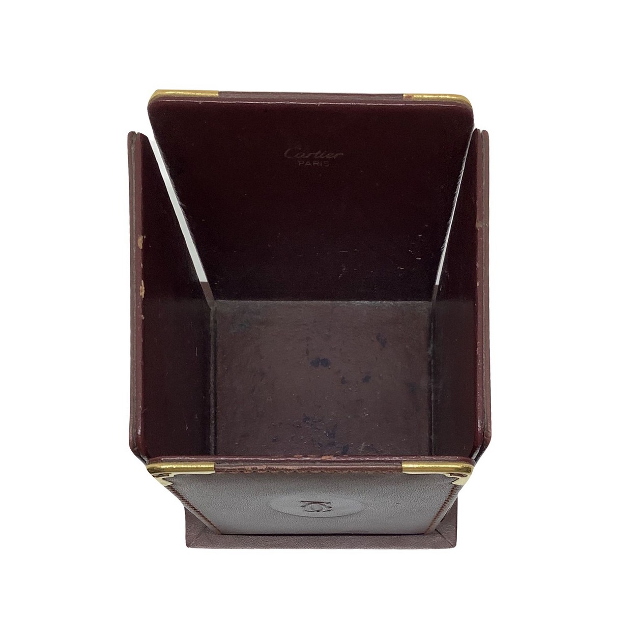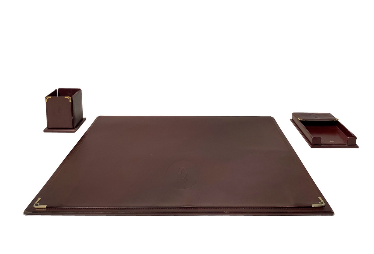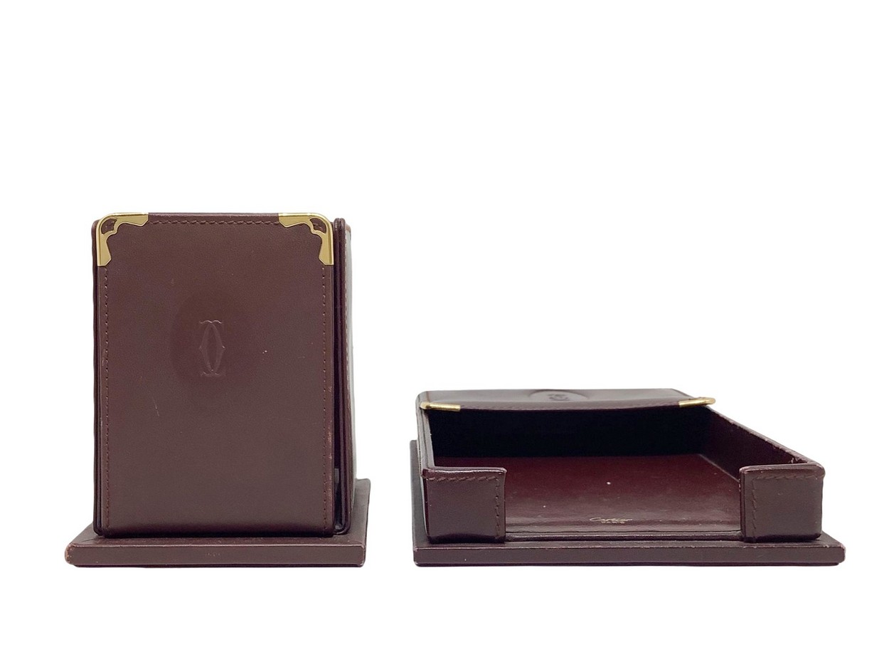 Set da scrivania Cartier in pelle color bordeaux Composto da portapenne, portacarte ecarpetta, dettagli dei bordi in ottone. Presenta segni di usuraComposto da portapenne, portacarte ecarpetta, dettagli dei bordi in ottone. Presenta segni di usura