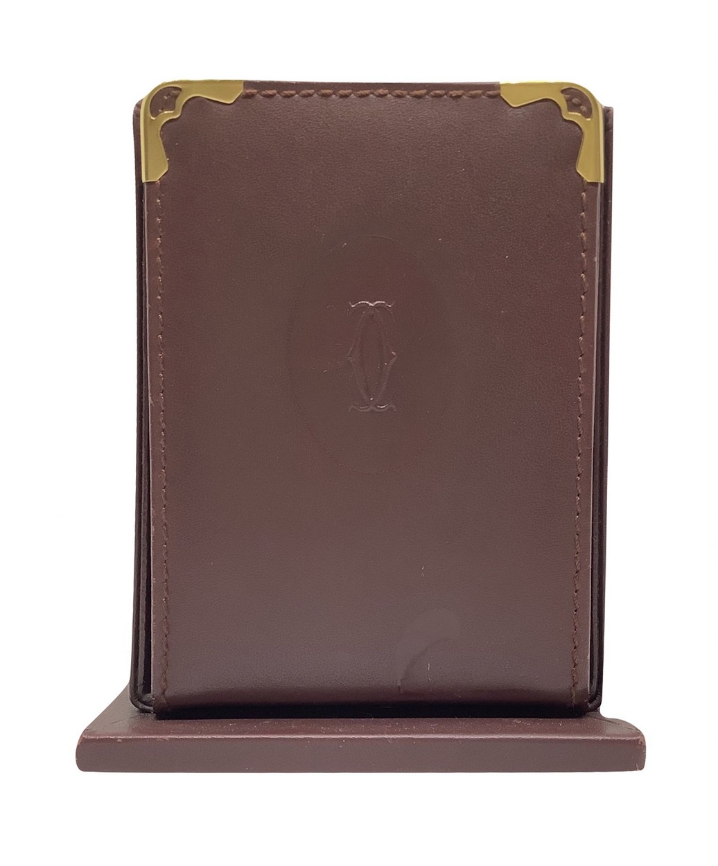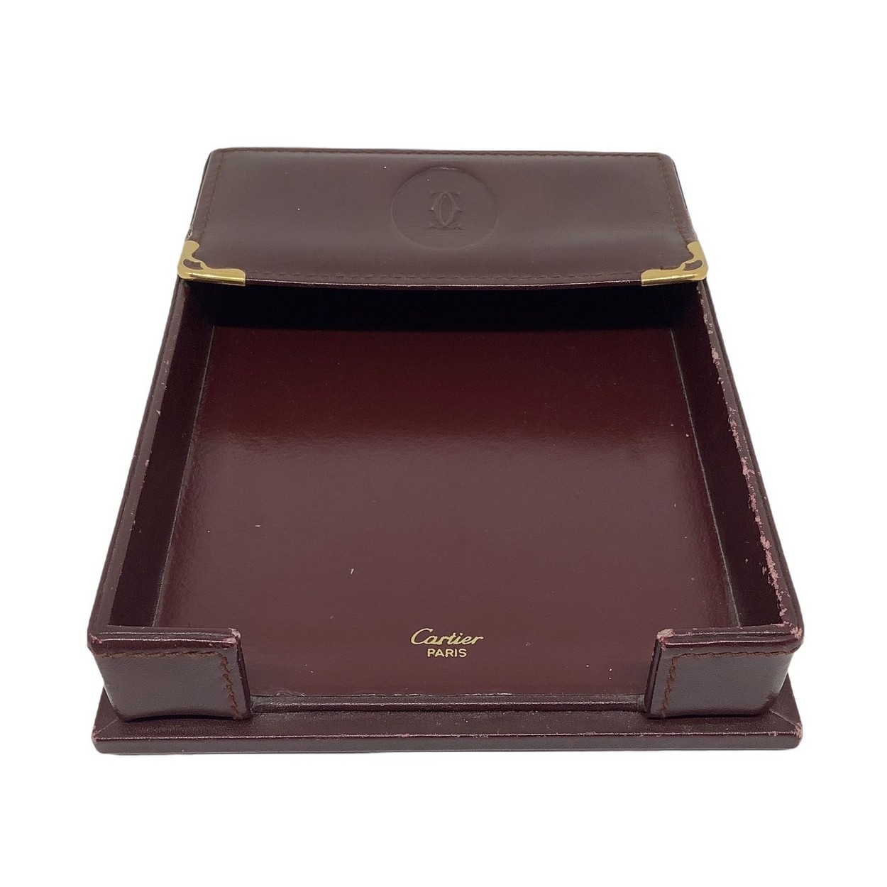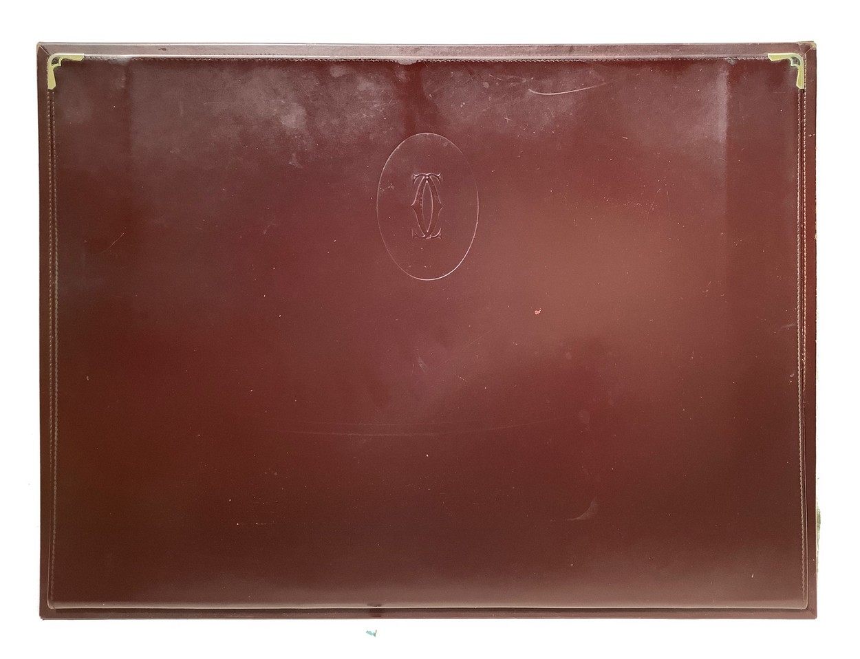 Set da scrivania Cartier in pelle color bordeaux Composto da portapenne, portacarte ecarpetta, dettagli dei bordi in ottone. Presenta segni di usuraComposto da portapenne, portacarte ecarpetta, dettagli dei bordi in ottone. Presenta segni di usura