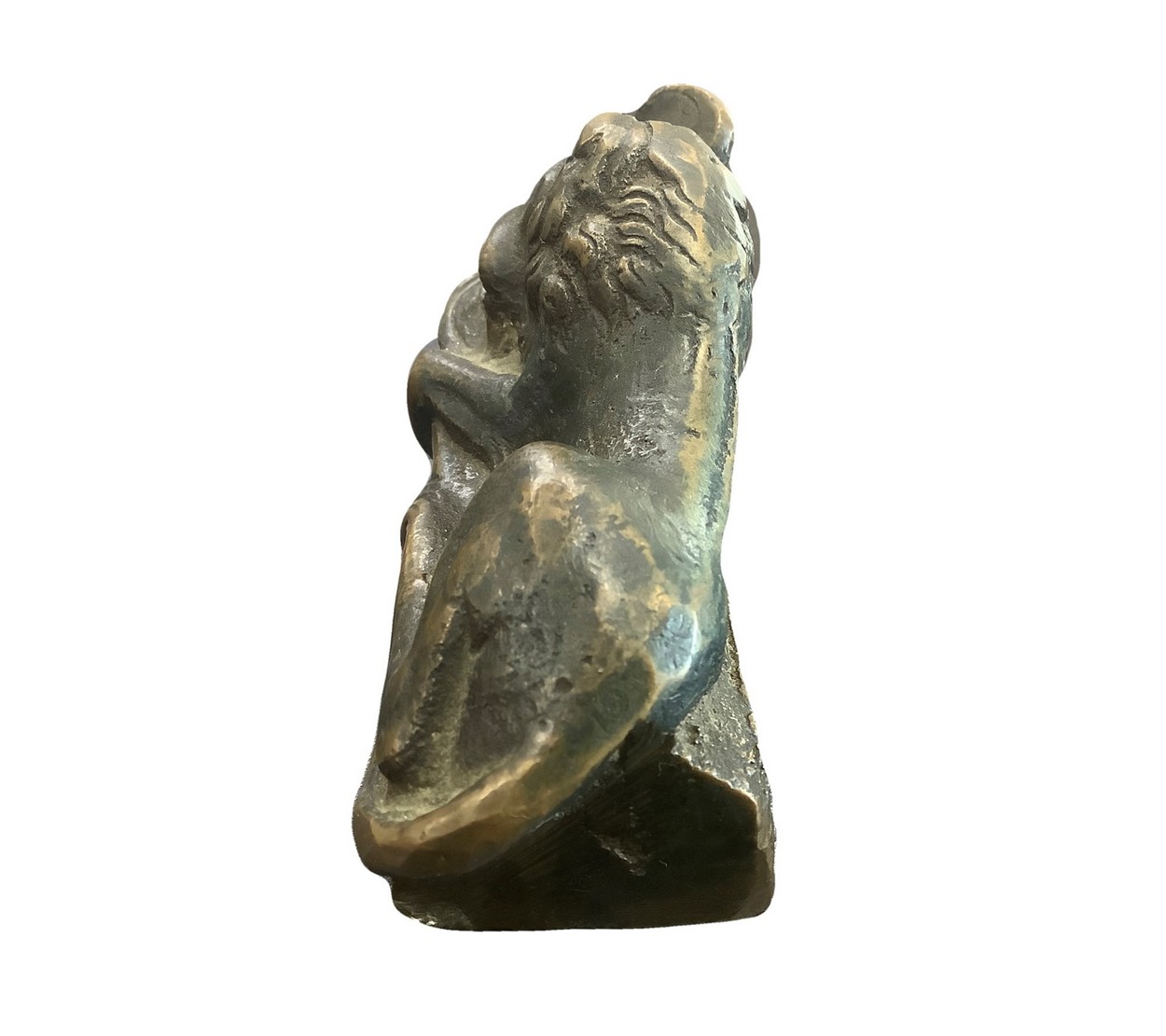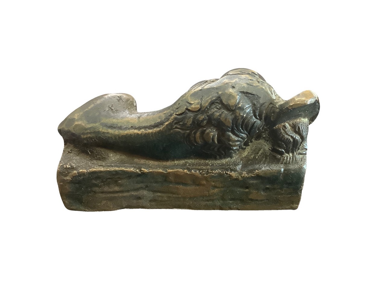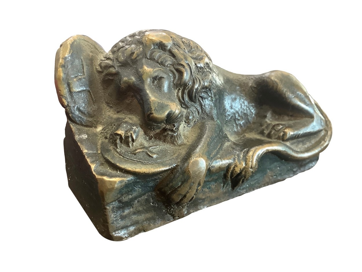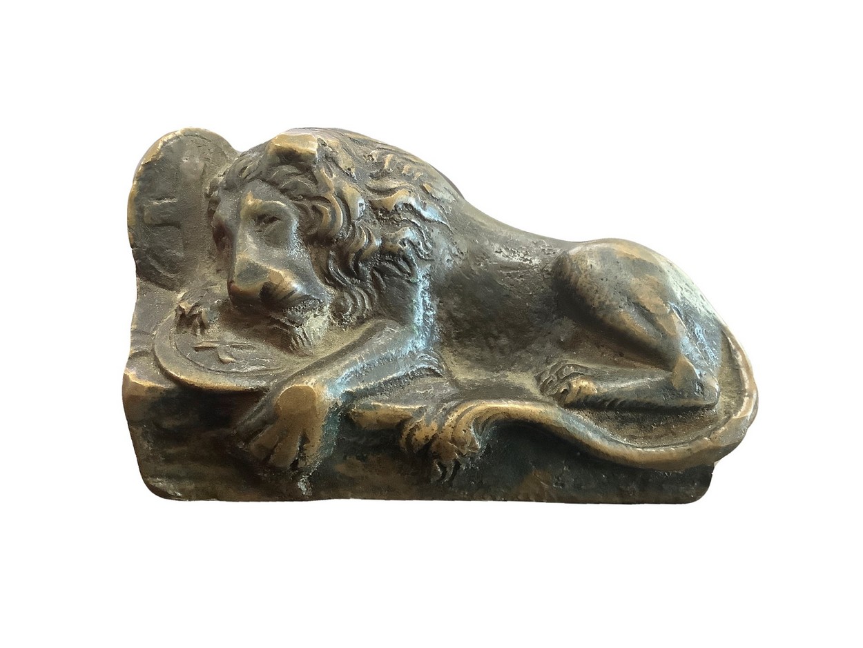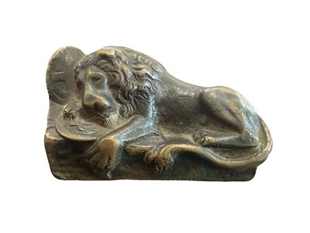 Fermacarte Leone in bronzo patinato oro H 3,5 cm, 8x2,5 cm