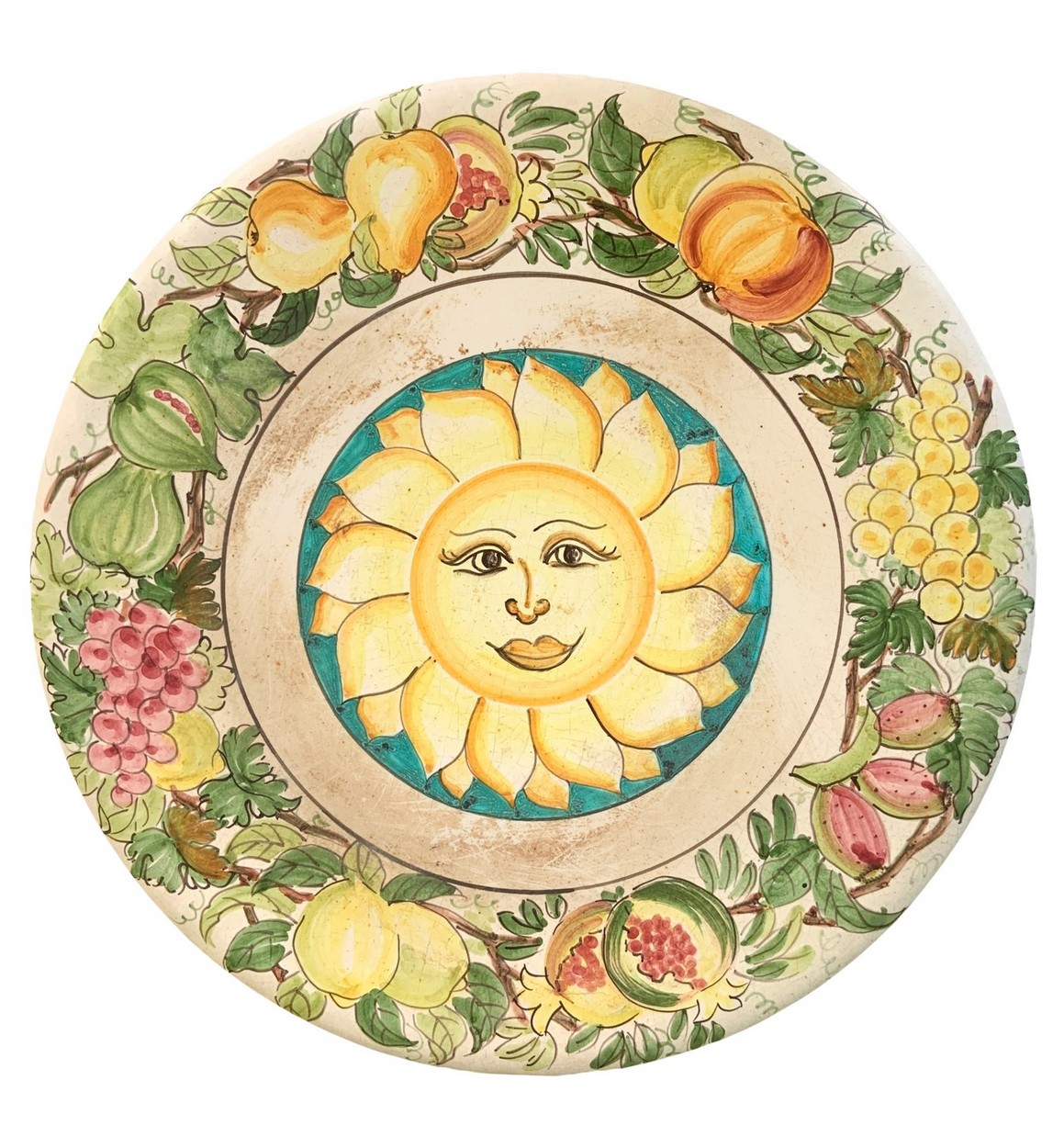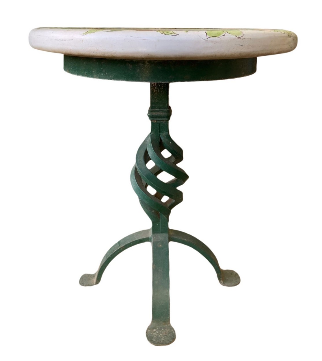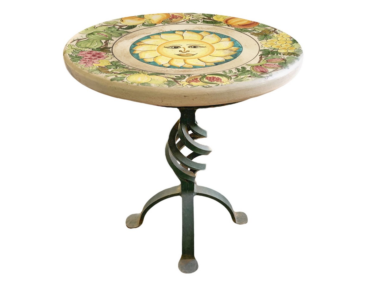 Tavolo basso in pietra lavica , 20th century Tavolo: H 47 cm, diametro 40 cm. decorato a ceramica policroma raffigurante sole centrale.decorato a ceramica policroma raffigurante sole centrale.