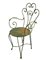 Tavolo rotondo in pietra lavica e n.4 sedie in ferro battuto. , 20th century Tavolo: H 80 cm. Diametro 115 cm. Decorato al piano con ceramica policroma con disegno raffigurante gelsomino e decorazione floreale sulla circonferenza. Segni d'uso.Decorato al piano con ceramica policroma con disegno raffigurante gelsomino e decorazione floreale sulla circonferenza. Segni d'uso.