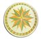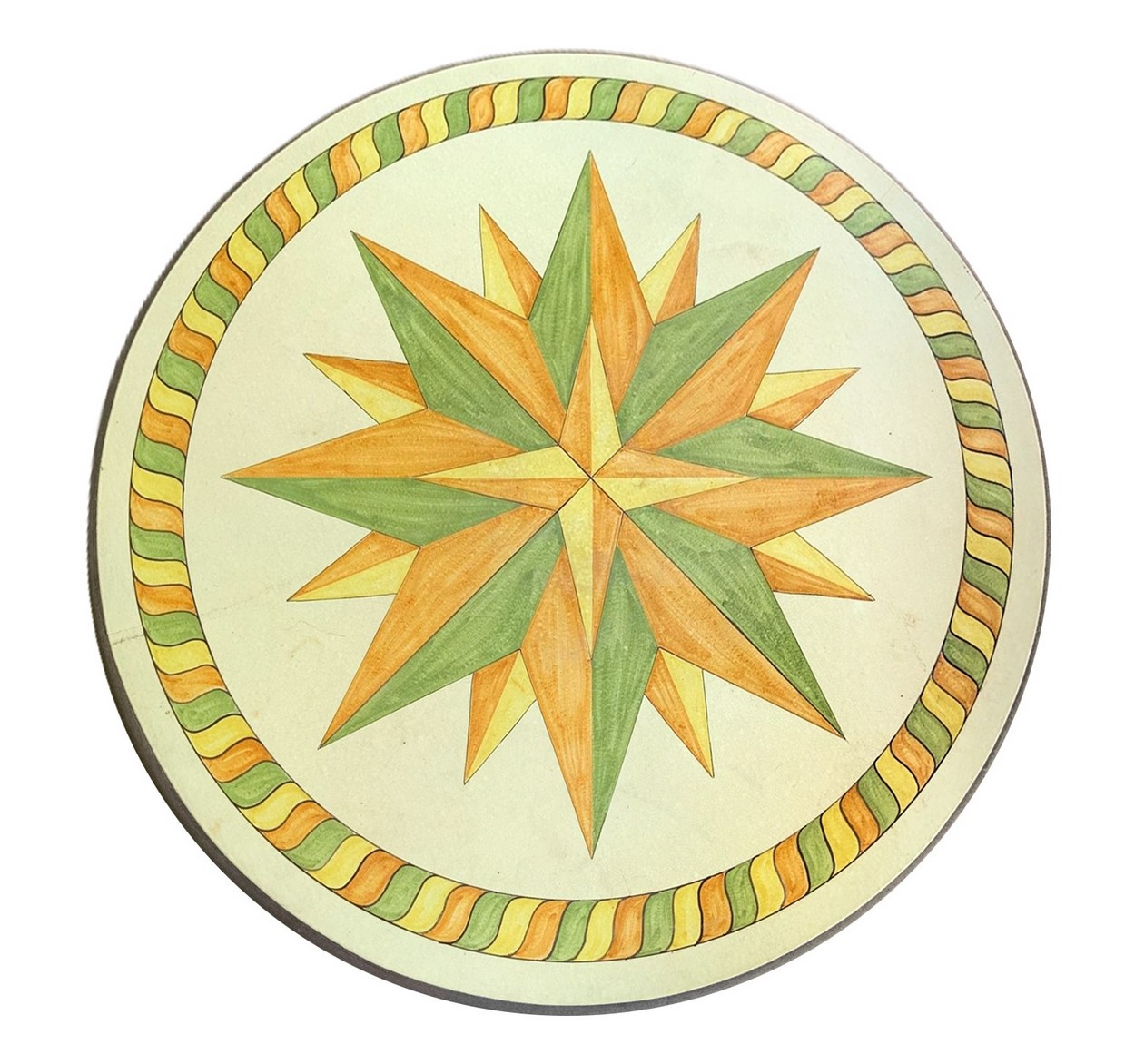 Tavolo rotondo in pietra lavica e N.4 sedie in ferro battuto, 20th century Tavolo H 80 cm, diametro 120 cm Decorato a ceramica policroma raffigurante rosa dei venti. Struttura portante in ferro battuto. Segni d'uso, mancante di una rotella.Decorato a ceramica policroma raffigurante rosa dei venti. Struttura portante in ferro battuto. Segni d'uso, mancante di una rotella.