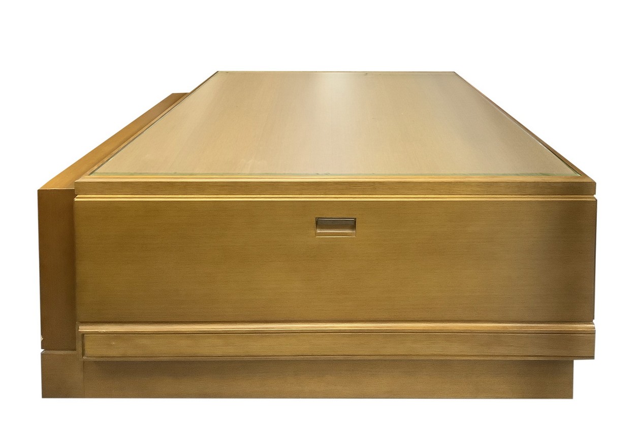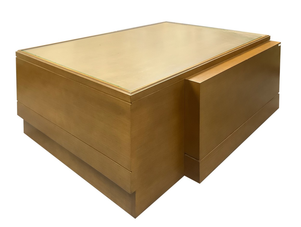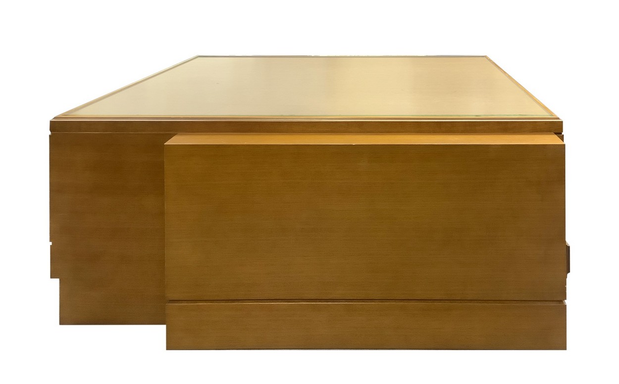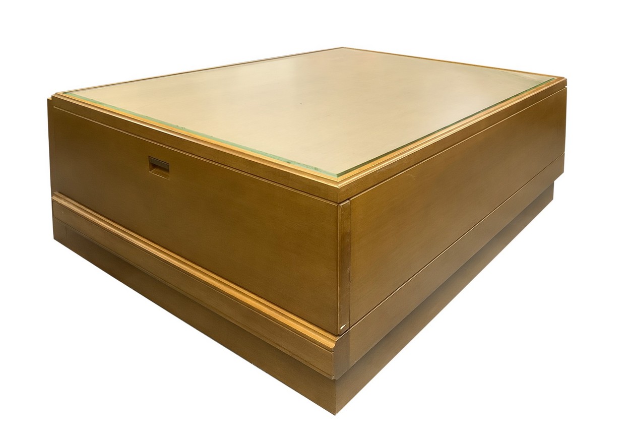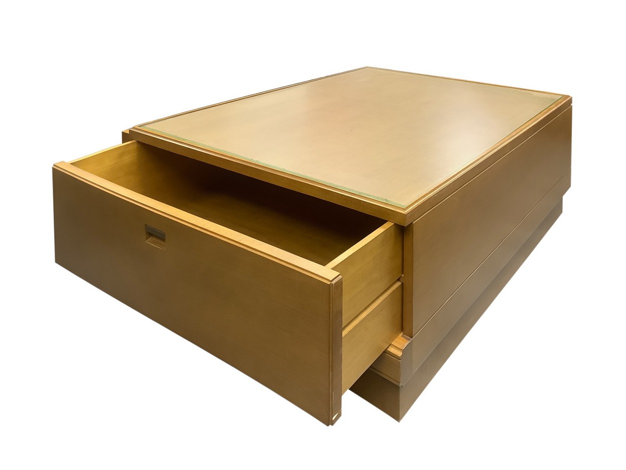 Tavolino basso in legno di rovere. H 45x110x90 cm Piano in vetro ,cassetto, ruote alla basePiano in vetro ,cassetto, ruote alla base