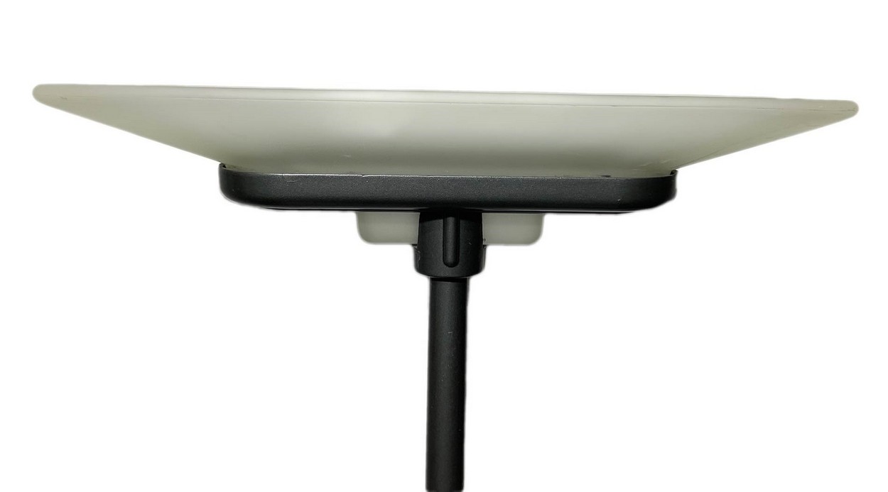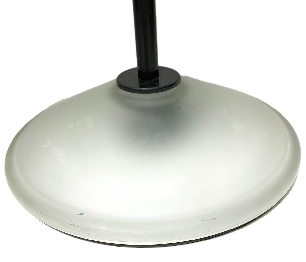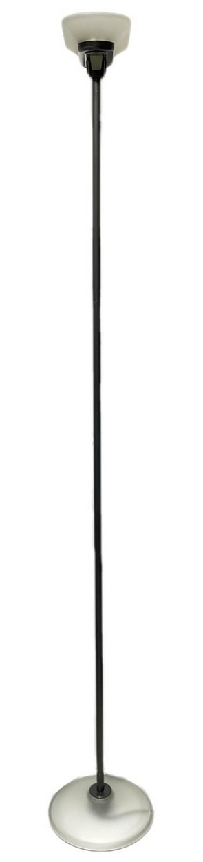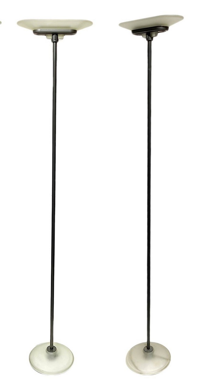 N. 2 lampade da terra in metallo laccato Arteluce, disegno P.King e Miranda. Diffusore e base in vetro satinato nei toni del rosa, illuminazione alogena.Arteluce, disegno P.King e Miranda. Diffusore e base in vetro satinato nei toni del rosa, illuminazione alogena.