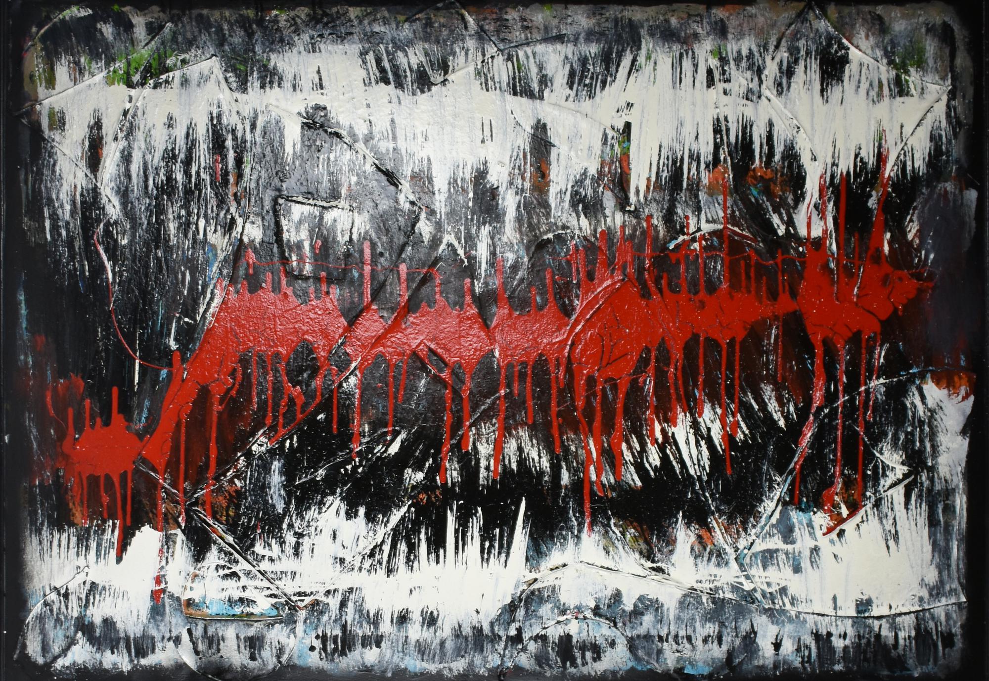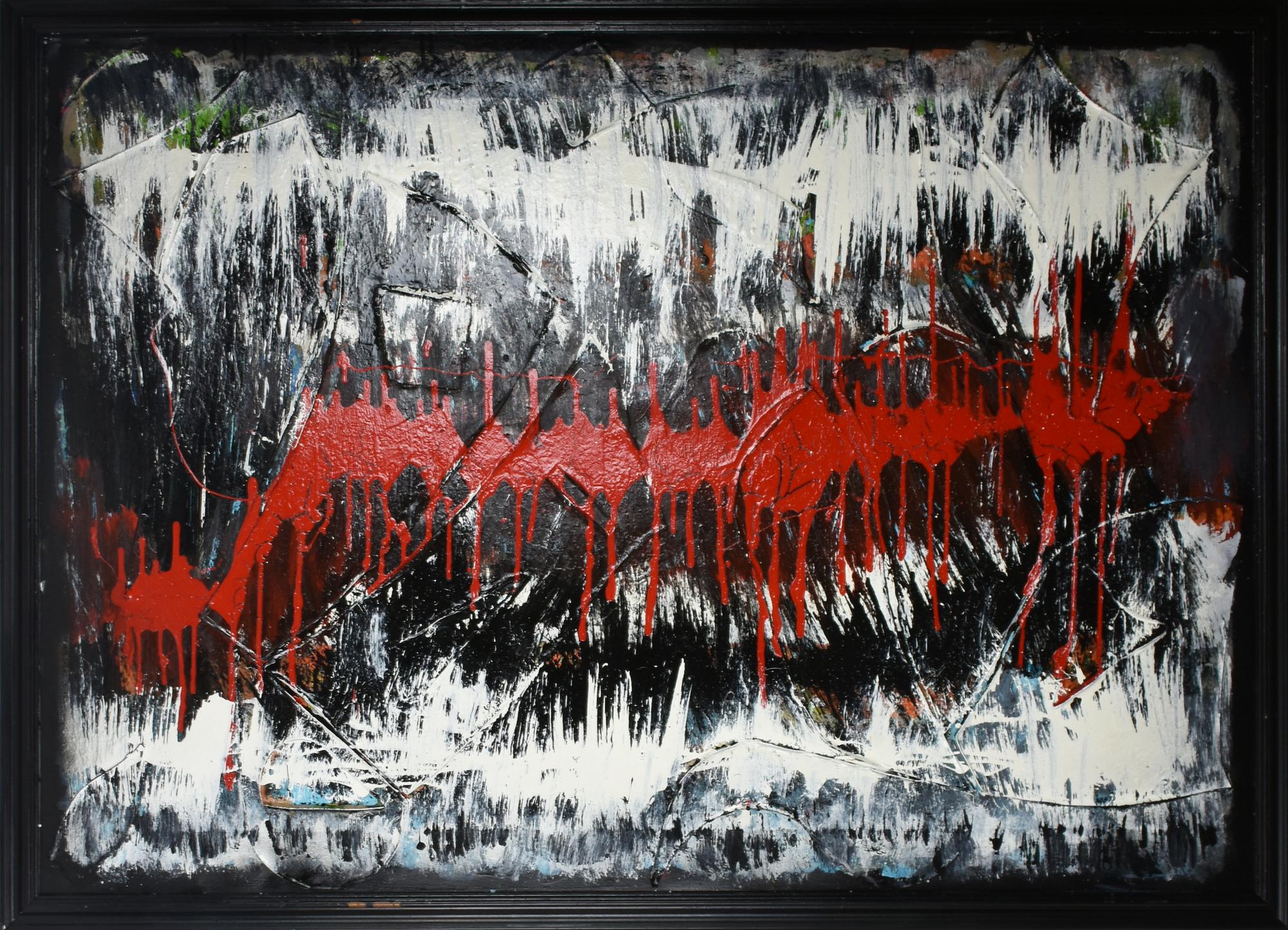 acrilico e applicazioni di pelle artificiale su tela applicata su tavola, cm 90x130
