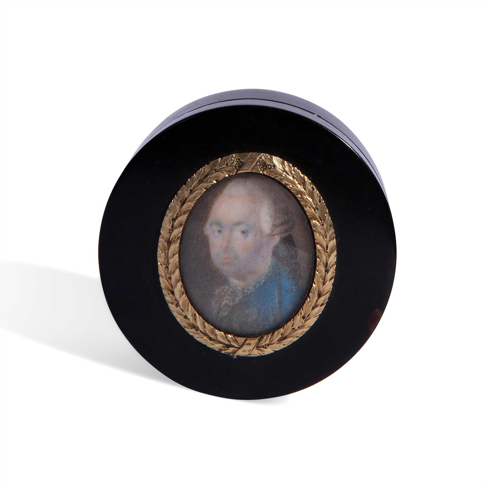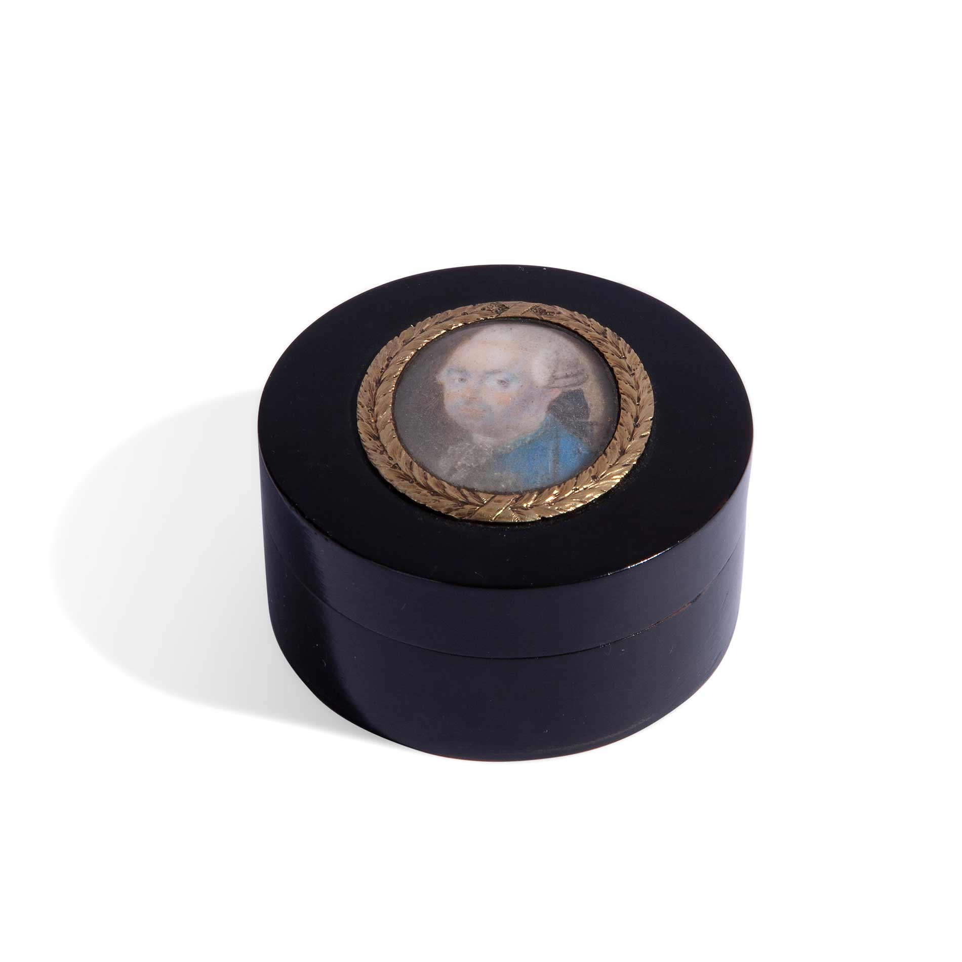Scatola in tartaruga e oro, primo quarto del XIX secolo Manifattura inglese, miniatura con cornice raffigurante un gentiluomo; oro 18 kti Diametro cm. 5,5