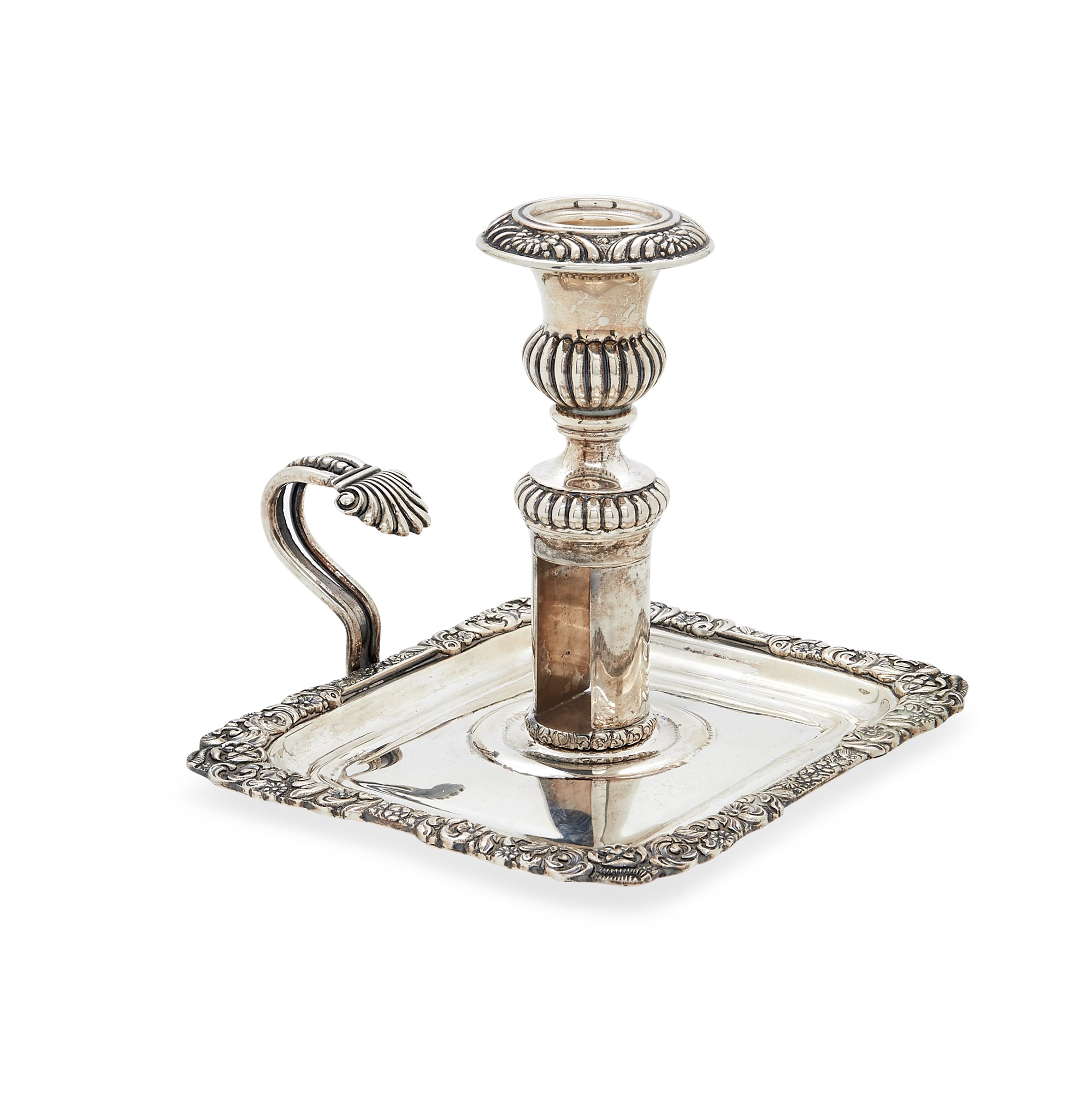 con piatto e manico decorati a sbalzo.