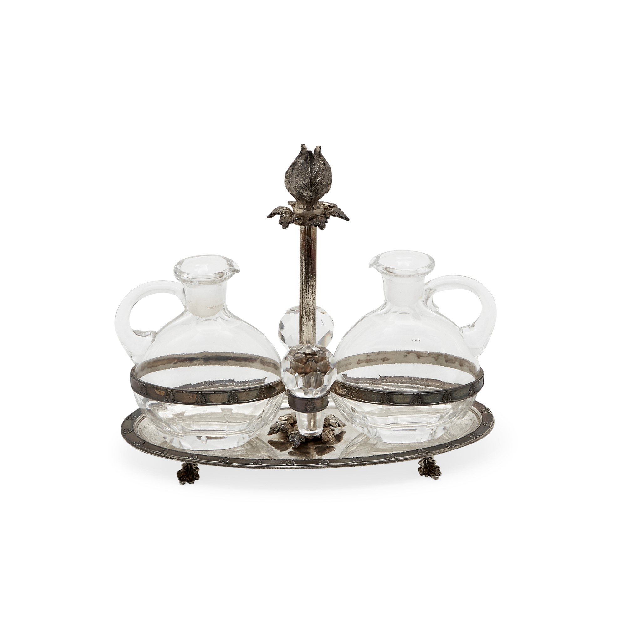 in argento 925, di forma ovale motivi fogliacei con porta olio e aceto in cristallo, con scatola.
